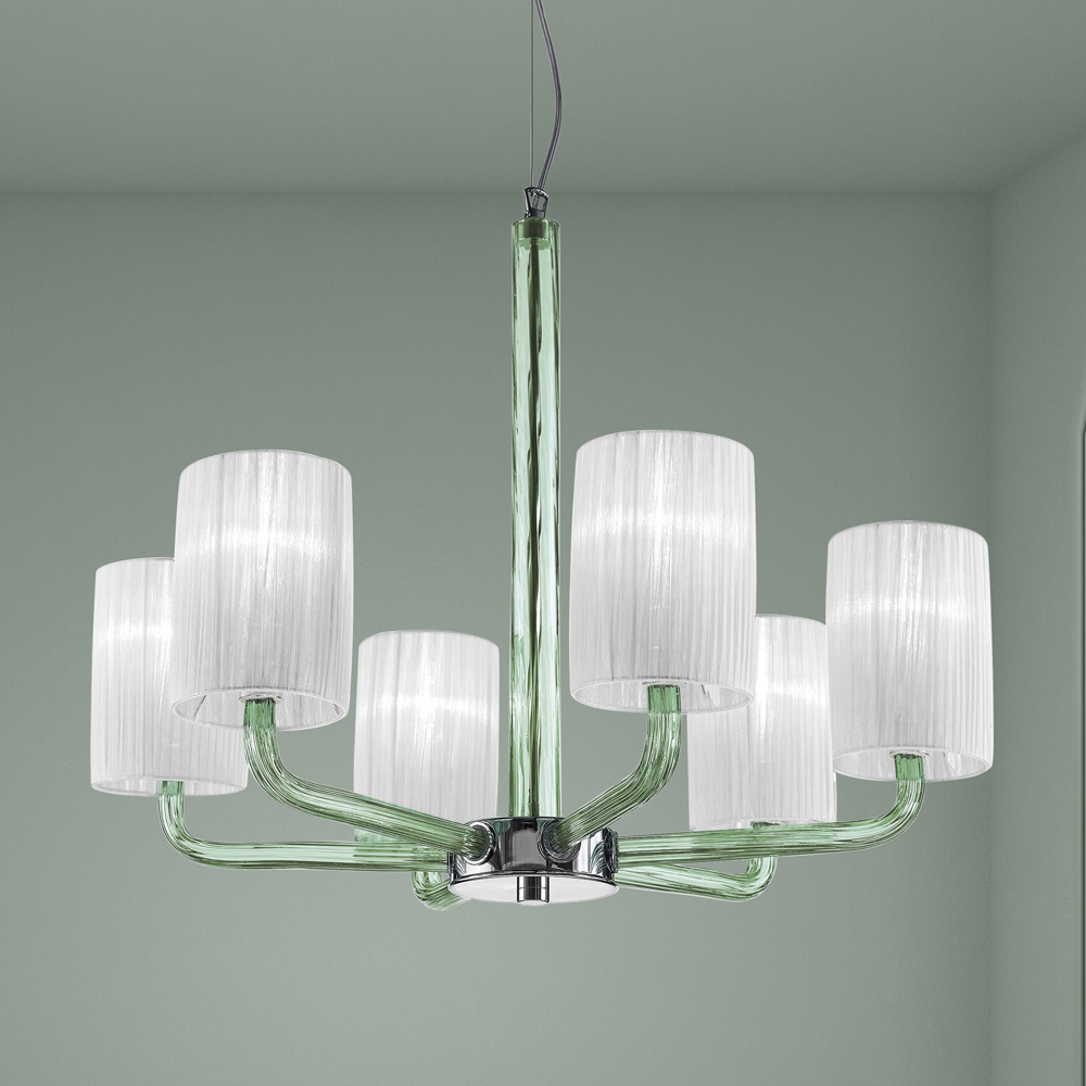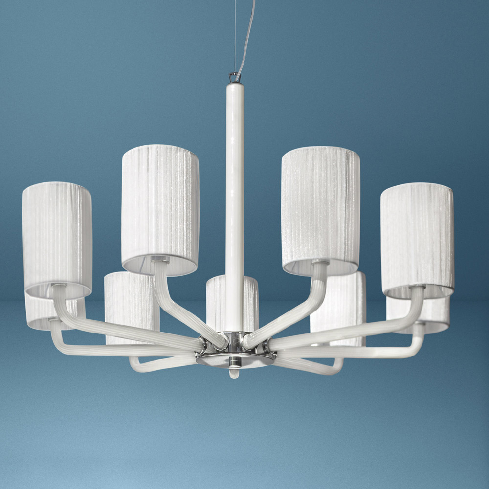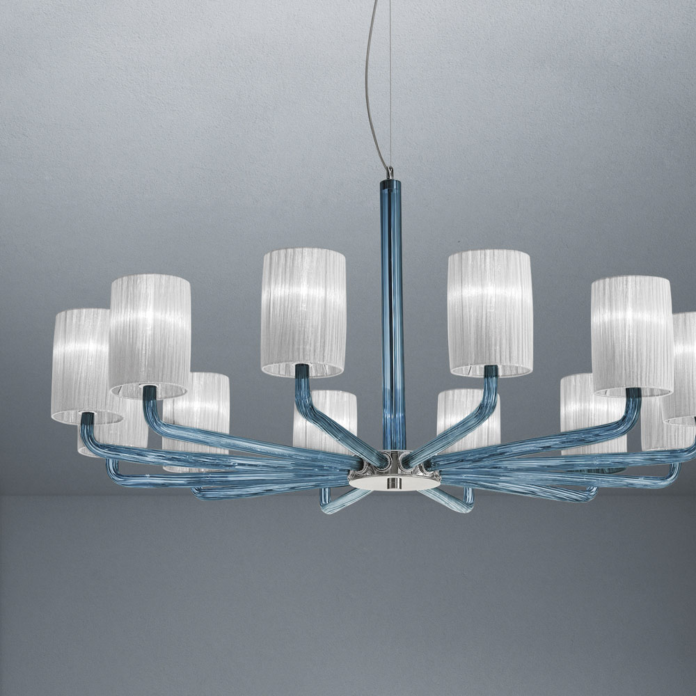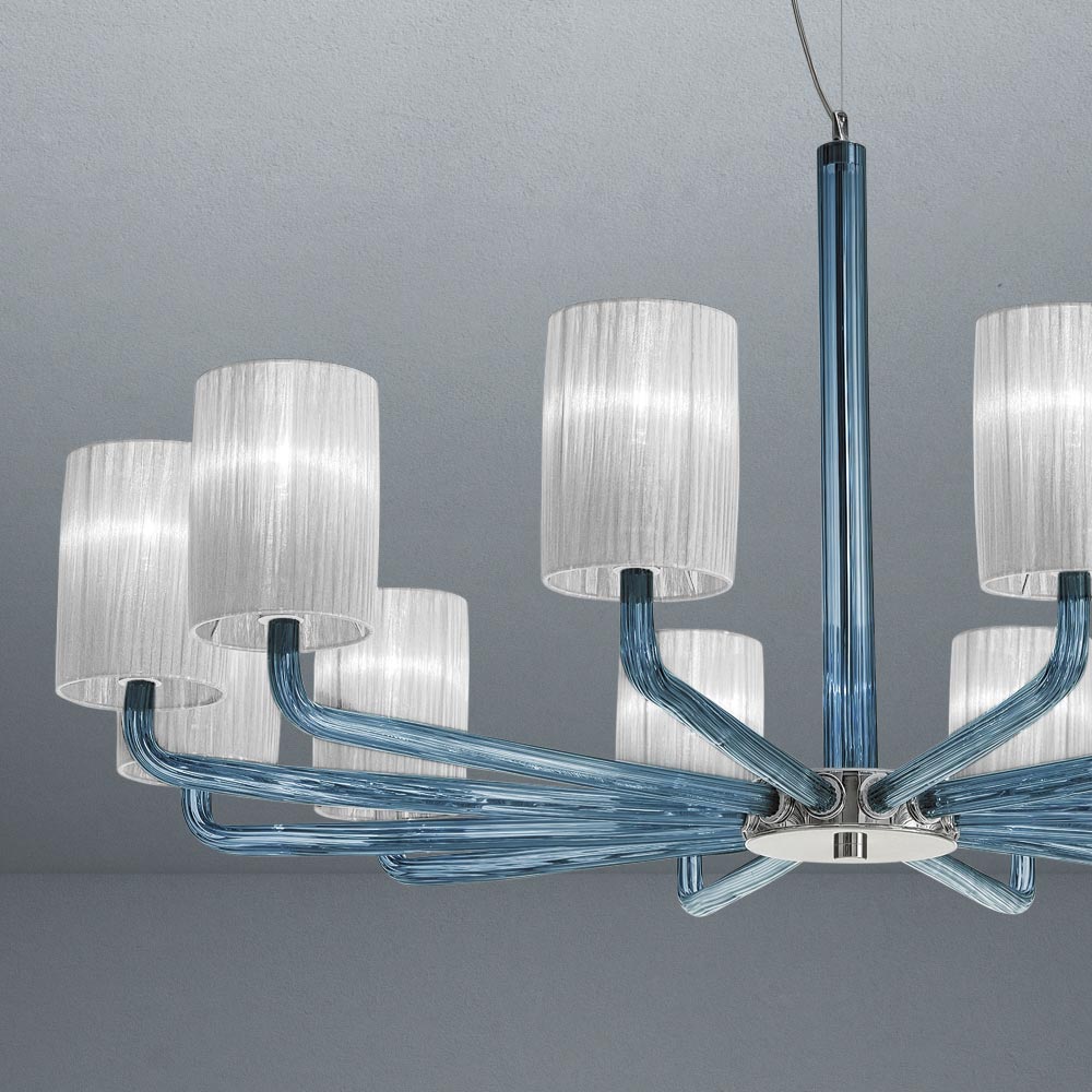 sterke aanwezigheid op het podium die typerend is voor de klassieke kroonluchters uit het verleden. De buisvormige glazen armen ondersteunen op een delicate en stijlvolle manier de prachtige stoffen lampenkappen die helpen om het licht in alle richtingen te dragen voor een