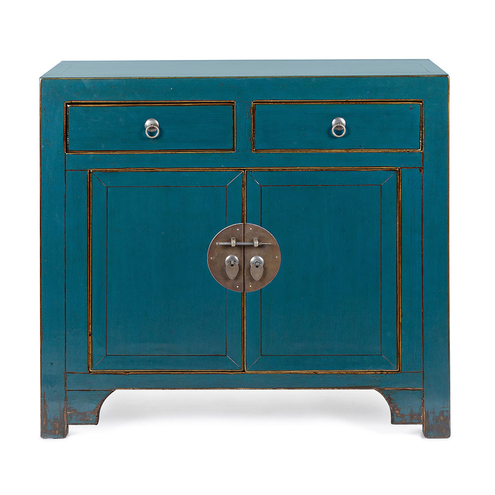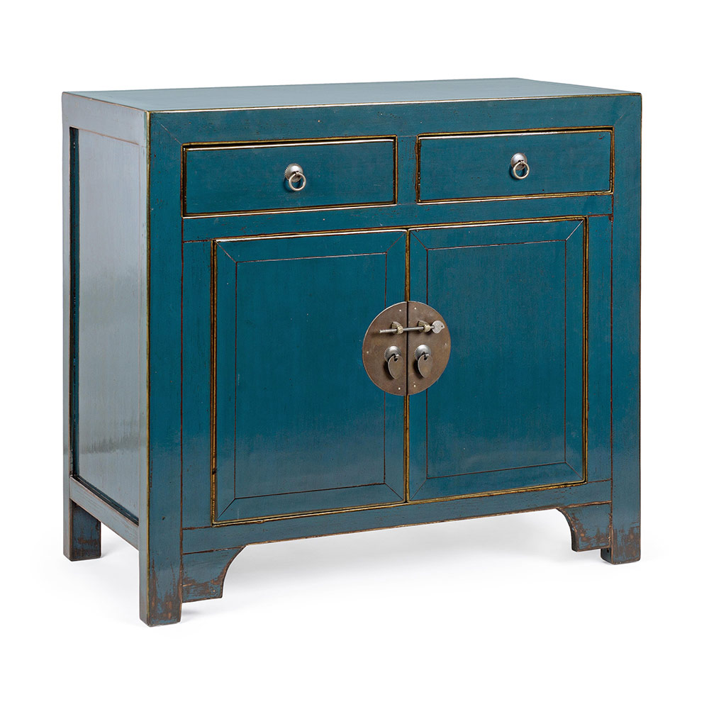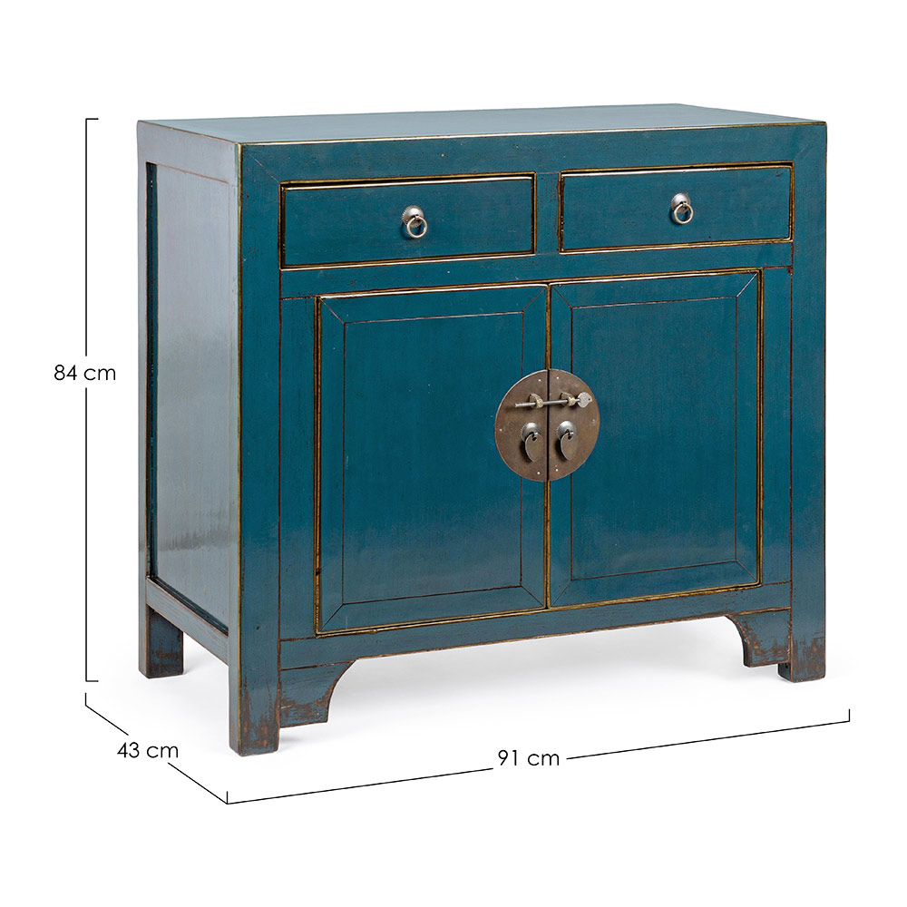 Dit design lage dressoir voor de woonkamer is voorzien van een blauw iepenhouten frame met een multiplex rug en binnenpanelen met een glanzende en gepatineerde afwerking op waterbasis.