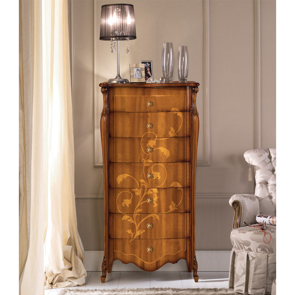 Bassano walnoothout met inlegwerk . De ladekast is verkrijgbaar in twee verschillende maten, om beter aan elke behoefte aan te passen. Een unieke en verfijnde aanvulling, volledig