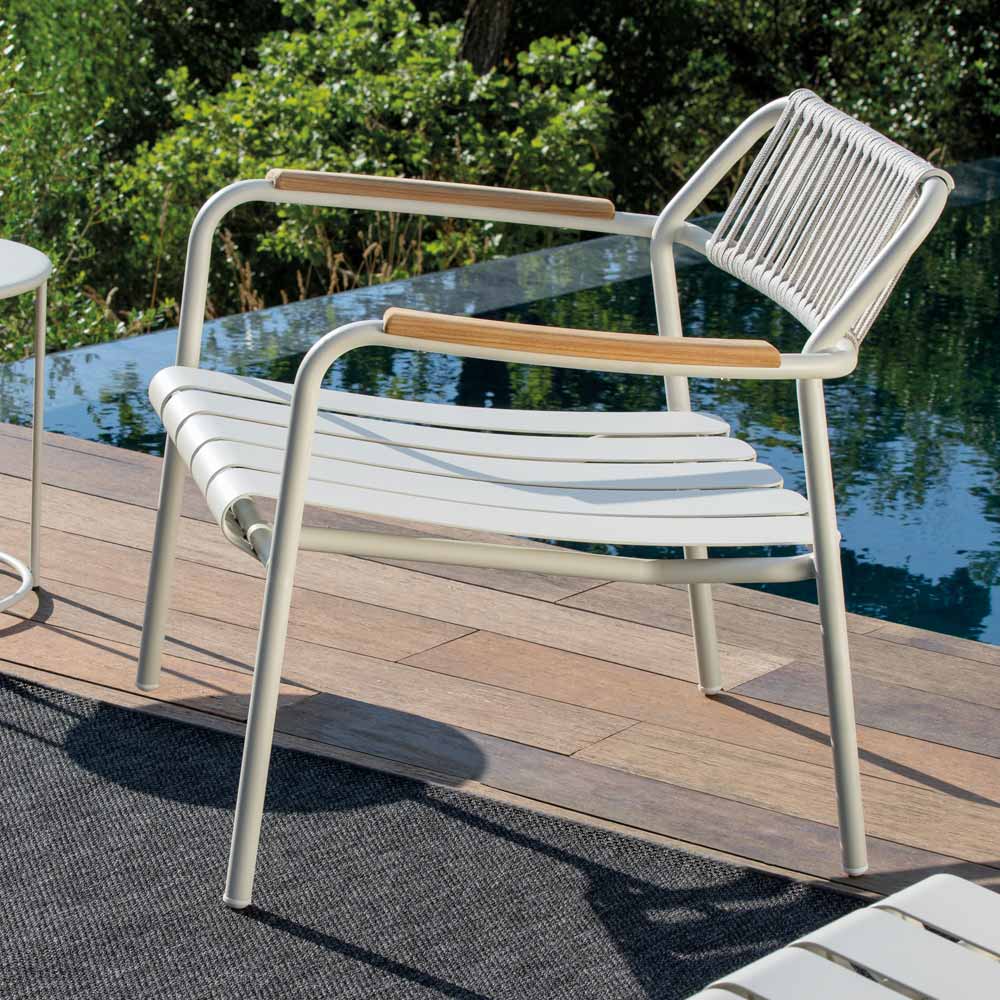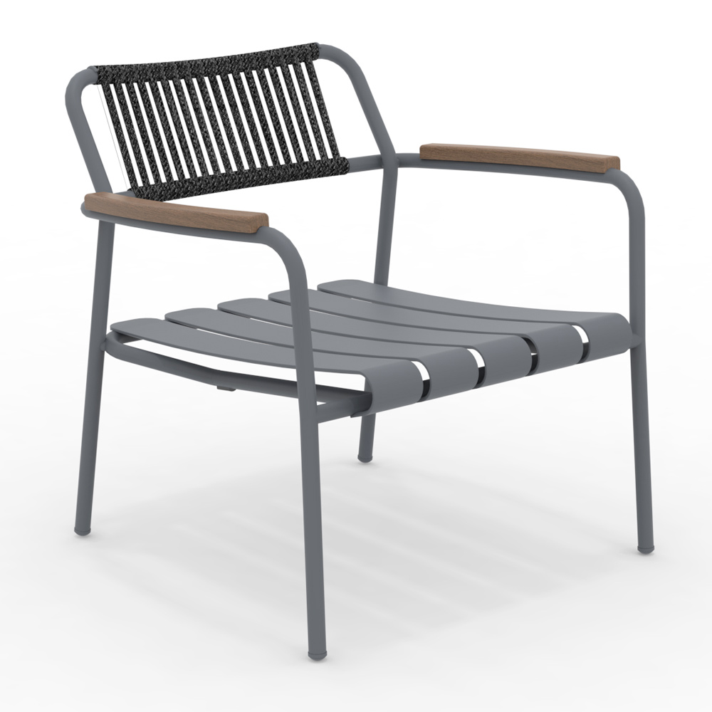 De lichte maar stevige structuur is ontworpen voor optimaal comfort, met een ergonomische zitting en een gevormde rugleuning van touw , die zorgen voor een comfortabele en ontspannende ondersteuning. De aluminium lamellen geven een dynamische en moderne uitstraling, terwijl de afwerking een vleugje elegantie en verfijning toevoegt.