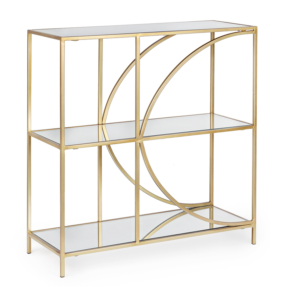 Lage vrijstaande stalen boekenkast en 3 glazen planken met een elegant design.