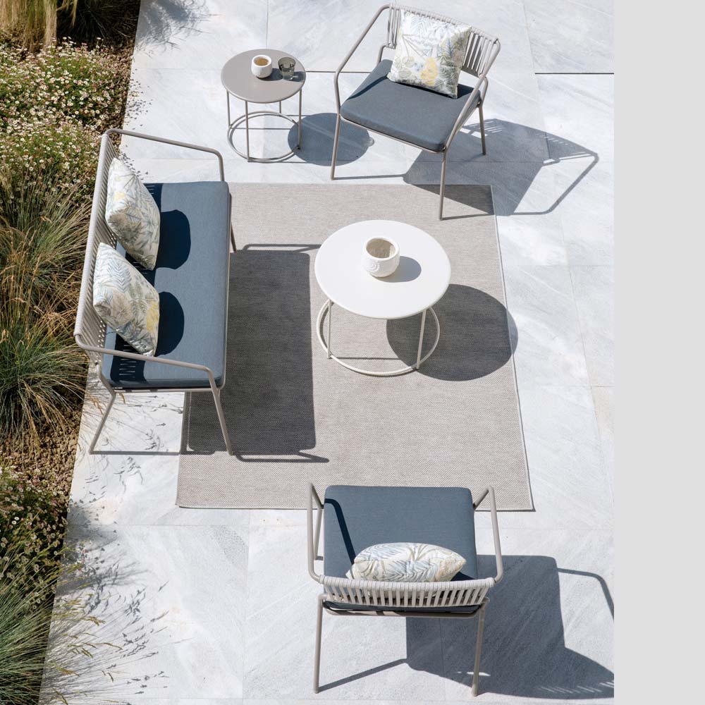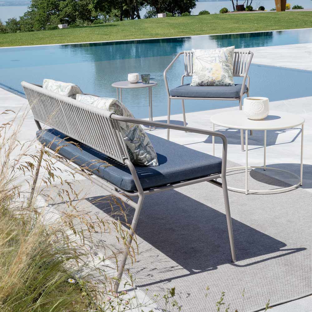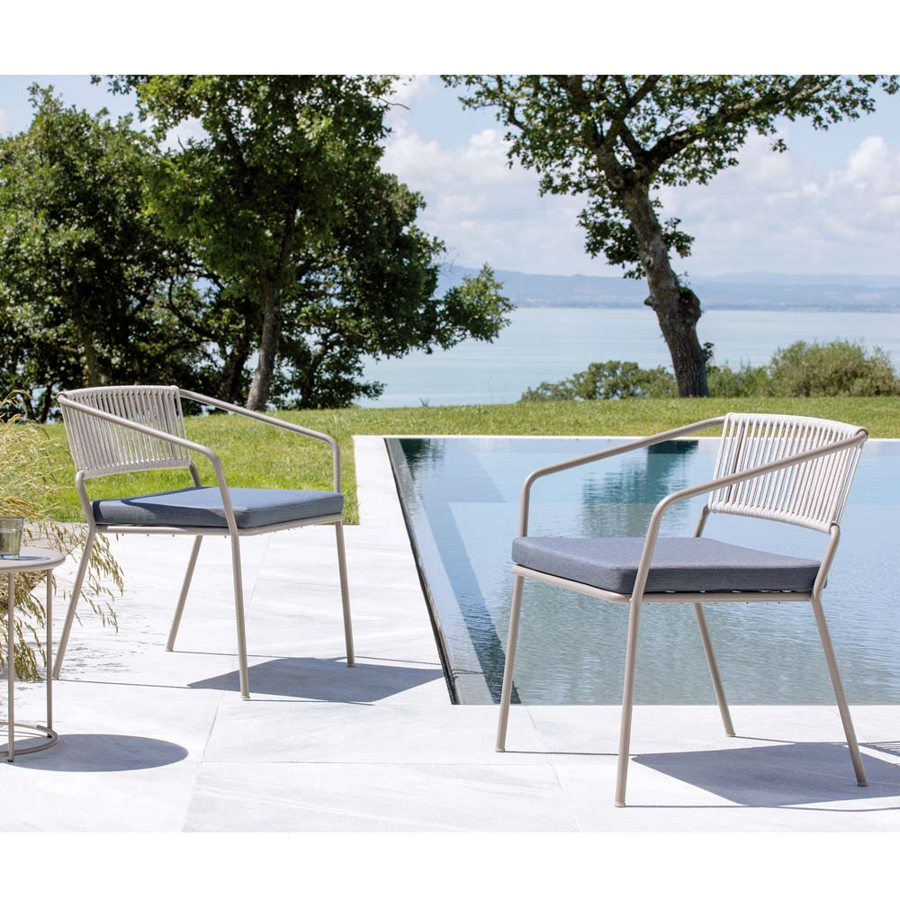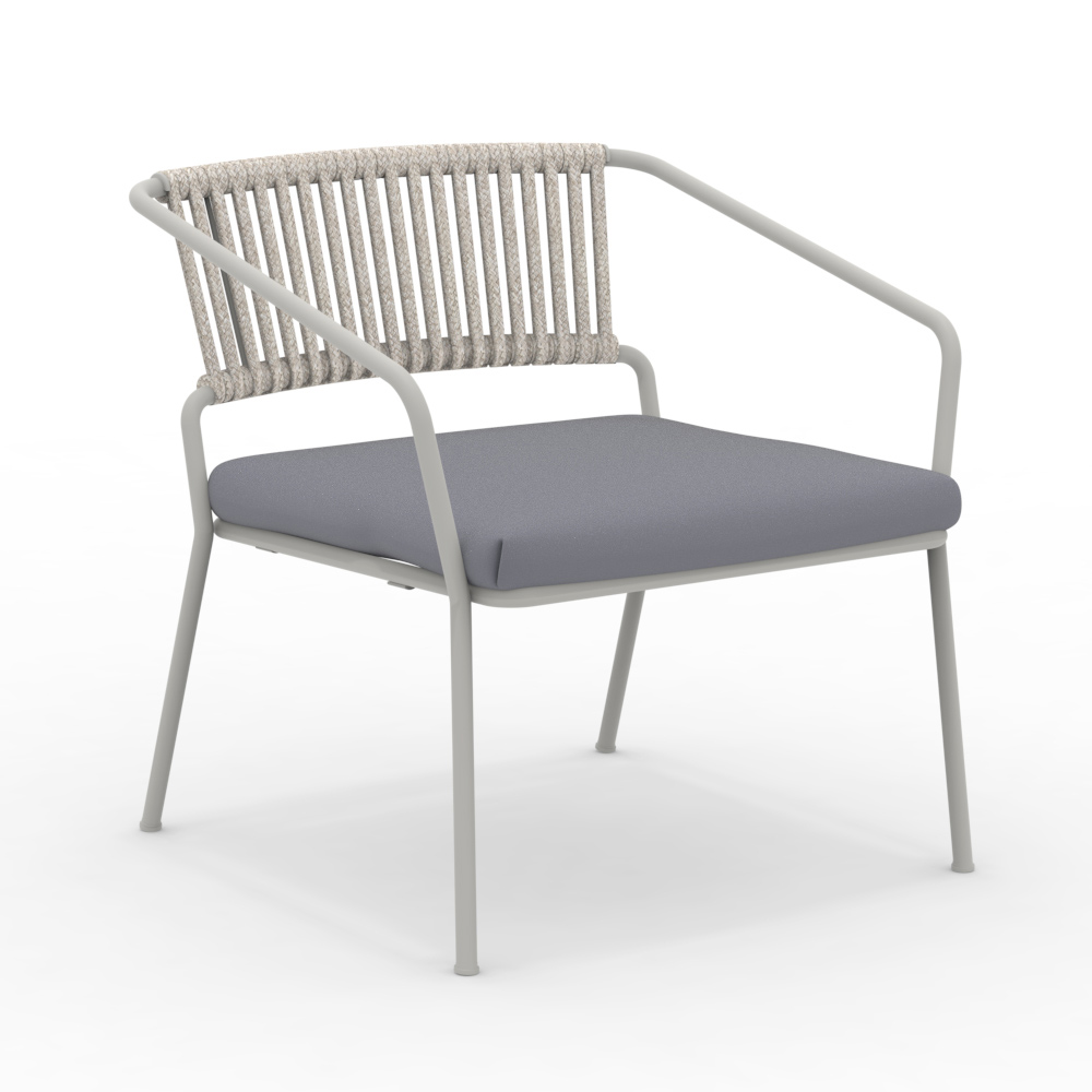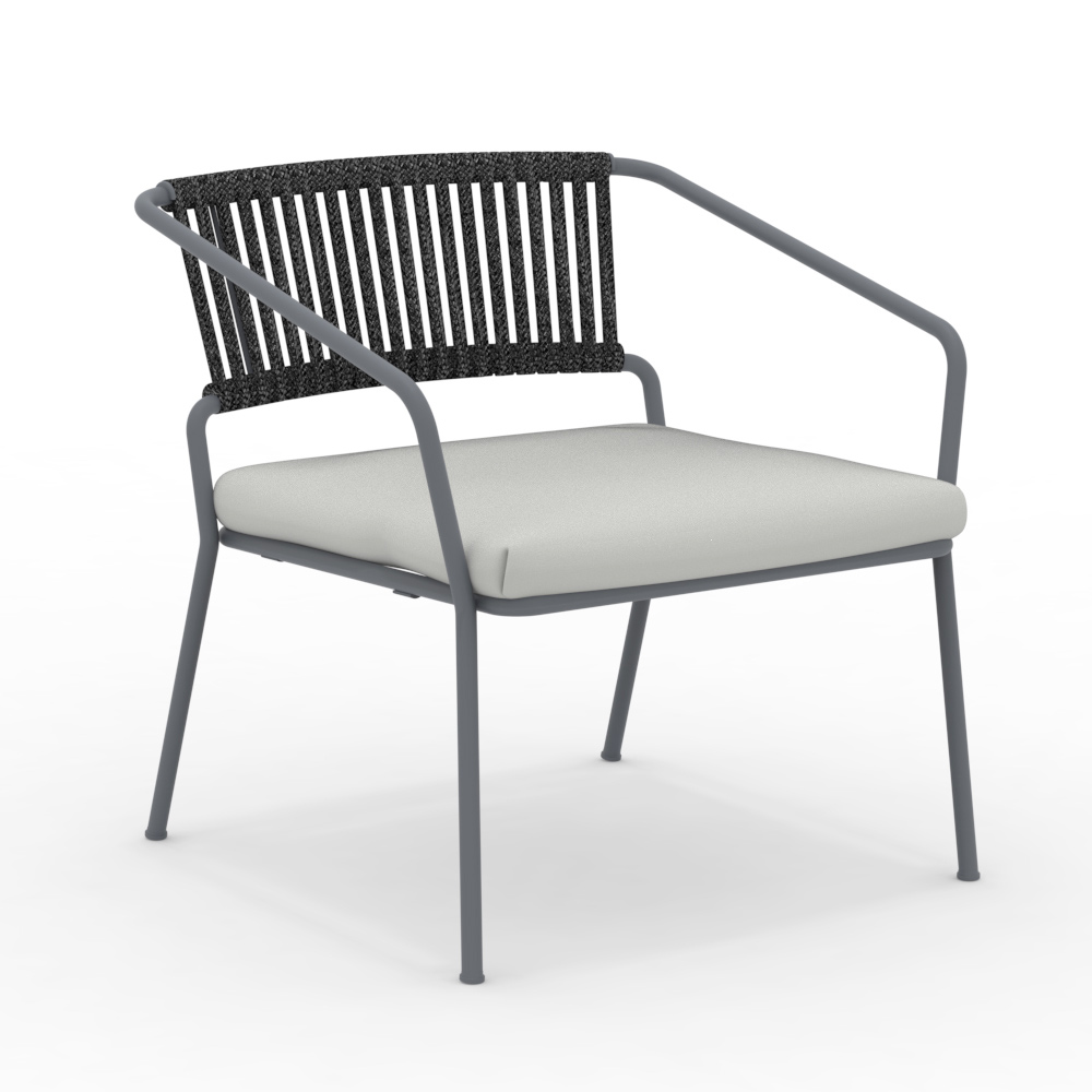 Lage tuinstoel met gepoedercoat gegalvaniseerd ijzeren frame en zitting van touw en stof. Gemaakt in Italië.
