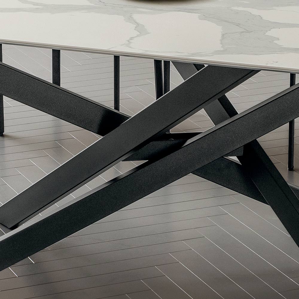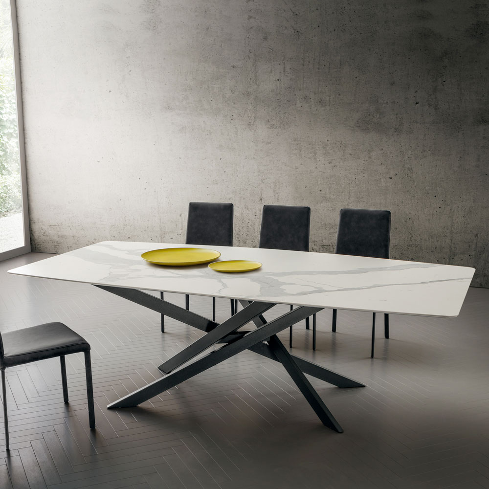 verfijnde en originele esthetiek die kenmerkend is voor elke omgeving, met elegante en verfijnde elementen die tegelijkertijd modern en creatief zijn. De eigenaardigheid van deze tafel is de basis met gekruiste poten die het ontwerp verrijkt door een revolutie teweeg te brengen in de stijl van de hele kamer waarvan hij de hoofdrolspeler wordt en elke aandacht verovert. Het prachtige tonvormige blad vervolledigt het uiteindelijke uiterlijk van de tafel en geeft een