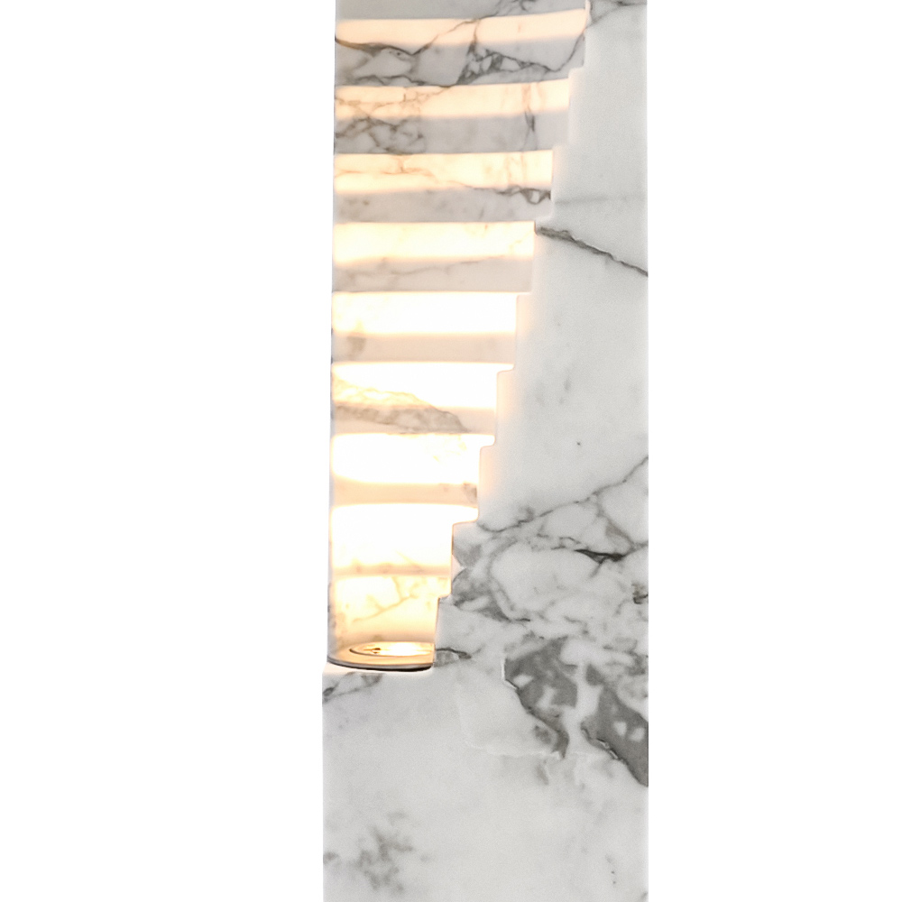 Laat u betoveren door deze marmeren lamp , een waar juweel van hedendaags design . De verticale structuur, majestueus en slank, is vakkundig uitgesneden om licht door de geometrische lijnen te laten filteren. Elk segment marmer, met zijn unieke nerven, wordt een levend canvas dat licht opvangt en verspreidt in een spel van clair-obscur dat elke omgeving verrijkt.