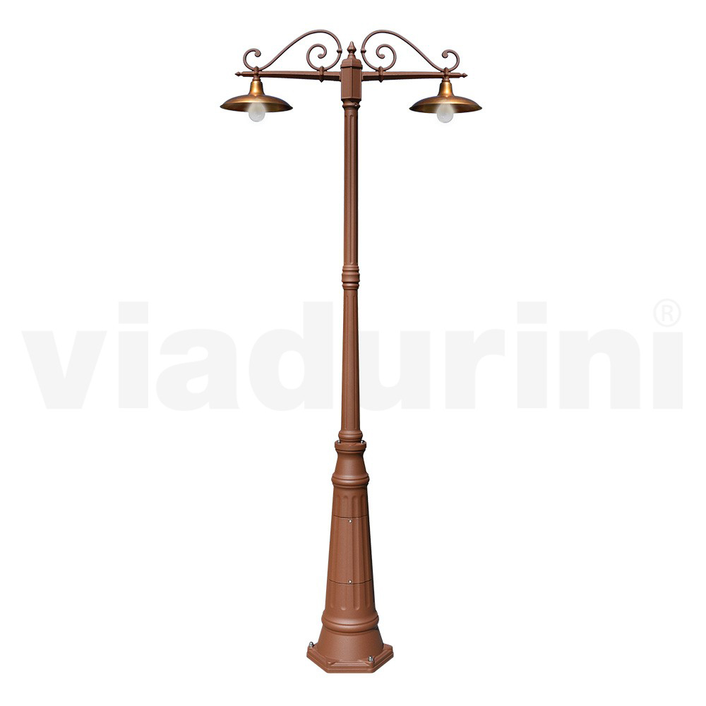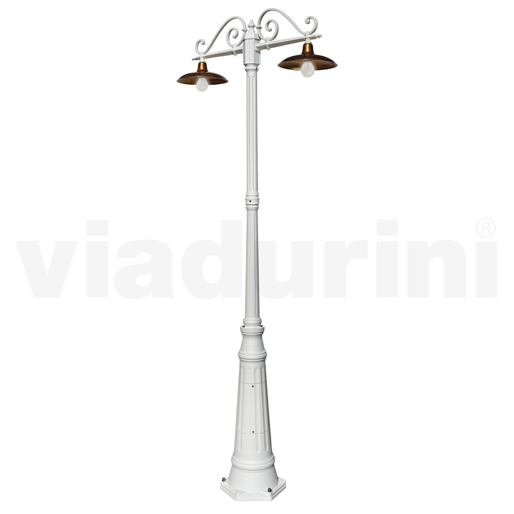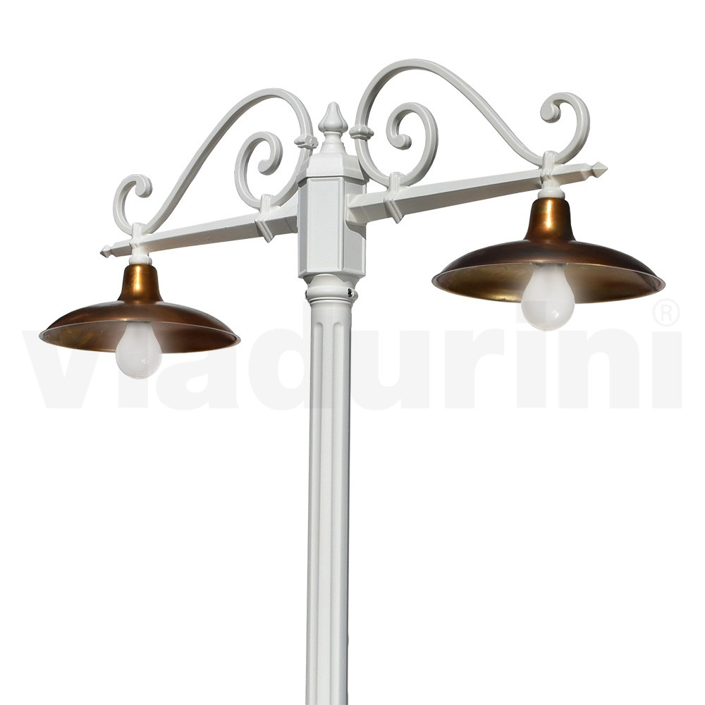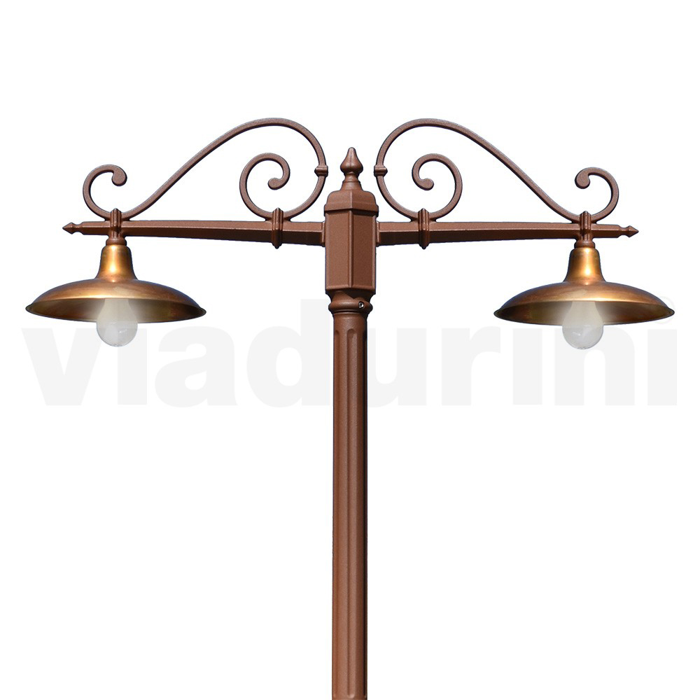Vintage buitenlantaarnpaal 2 lampen in aluminium en messing Made in Italy.