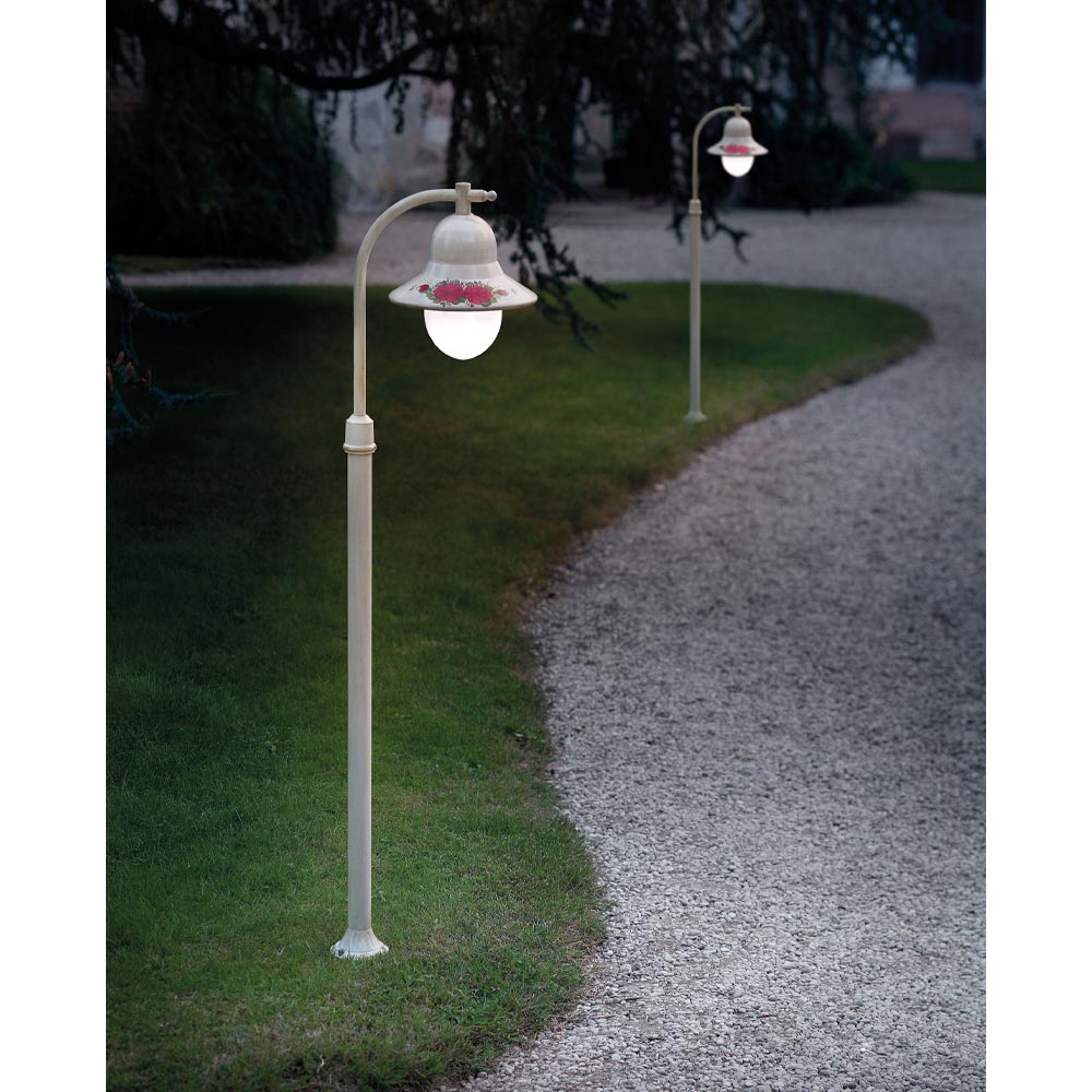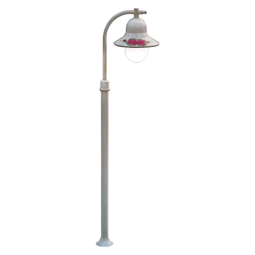 Deze lantaarnpaal voor buiten is volledig gemaakt van geschaduwd wit aluminium en versierd met handgeschilderde bloemen voor een klassieke en harmonieuze stijl tussen vorm en kleuren.