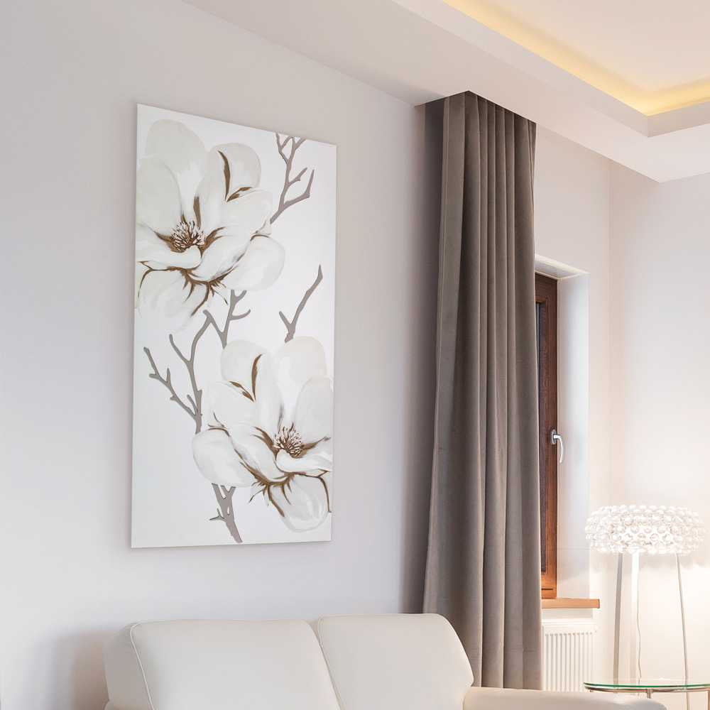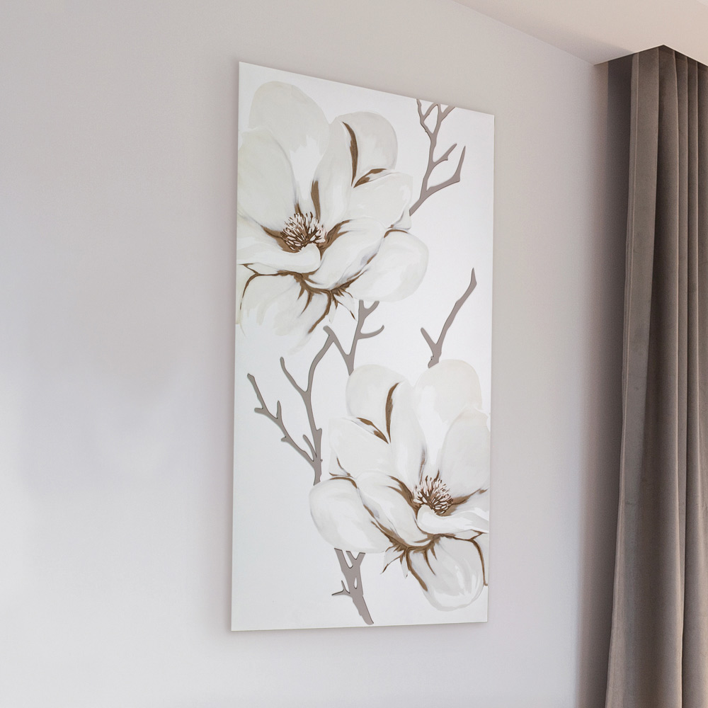 Het paneel met decoratie is gemaakt met behulp van de lasermarkeertechniek die een bas-reliëf op het materiaal creëert, waardoor verschillende kleurgradaties van de bloemblaadjes op het paneel ontstaan. Het Magnolia paneel is gemaakt van mat wit gelakt hout met kiezelkleurige applicaties. Een elegant meubelstuk met twee delicate Magnolia-bloemen, tot in detail gegraveerd met een laser met kiezelkleurige decoraties.