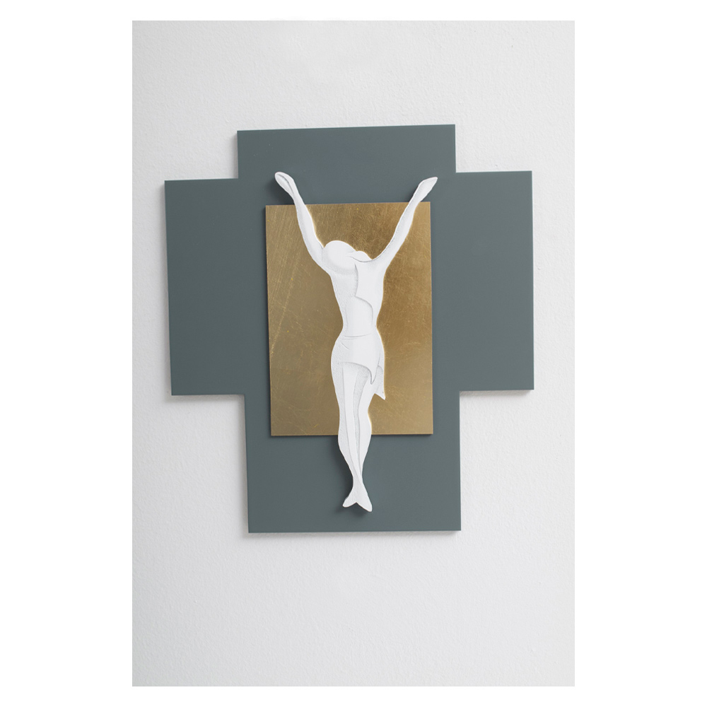 Kruisbeeld in blauw gelakt hout met applicatie van een vierkant in kostbaar bladgoud en Jezus in wit gelakt hout met lichte lasergravures.