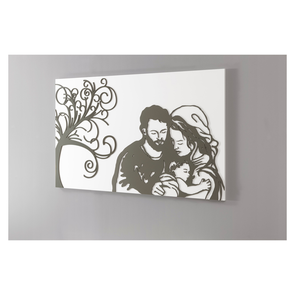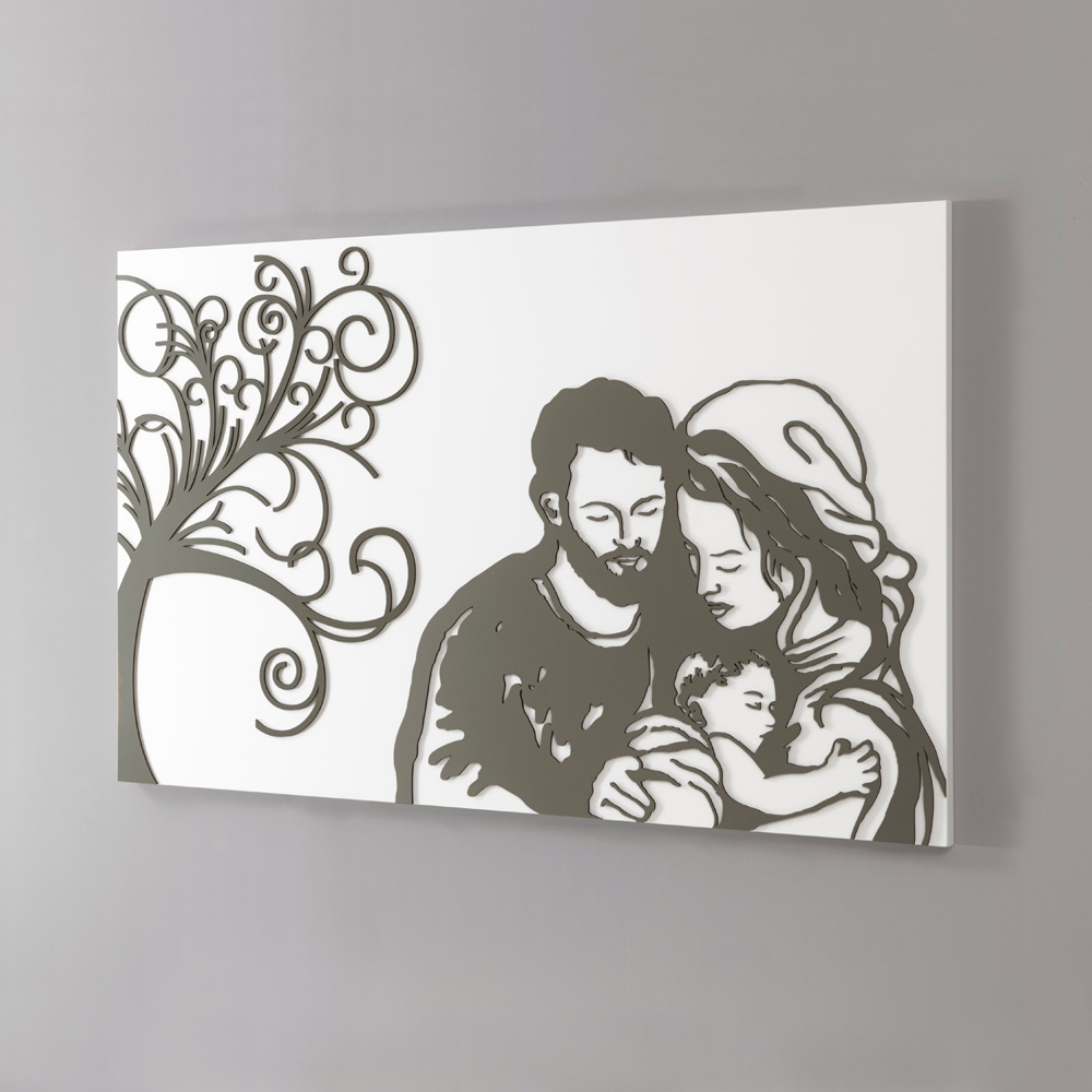 Dit schilderij is het resultaat van Italiaans vakmanschap, in feite worden de figuren met de hand getekend en vervolgens geverfd met het licht van de laserstraal, zonder enige verspilling en met respect voor het milieu. Het is bedoeld om de zoetheid van het gezin weer te geven in combinatie met het symbool van de levensboom om een sterke en intense emotie op te wekken bij degenen die het observeren.