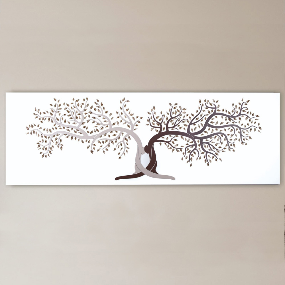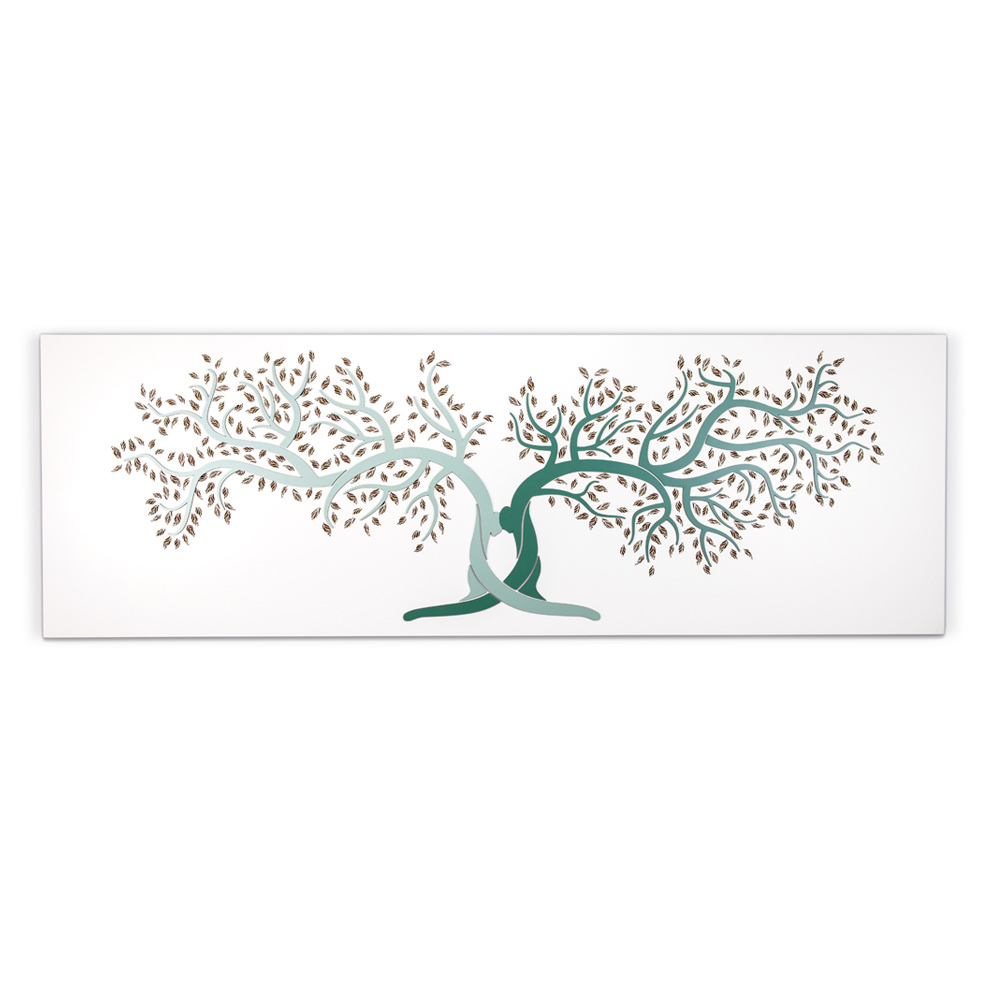 Decoratief paneel dat de vereniging van twee stammen voorstelt met een omhelzing, symbool van het leven. Takken en bladeren gemaakt met lasermarkering vertakken zich vanaf de stam. Mat wit gelakt houten paneel met applicaties in gelakt hout in twee tinten grind en cacao of in de groene variant en lasermarkering.
