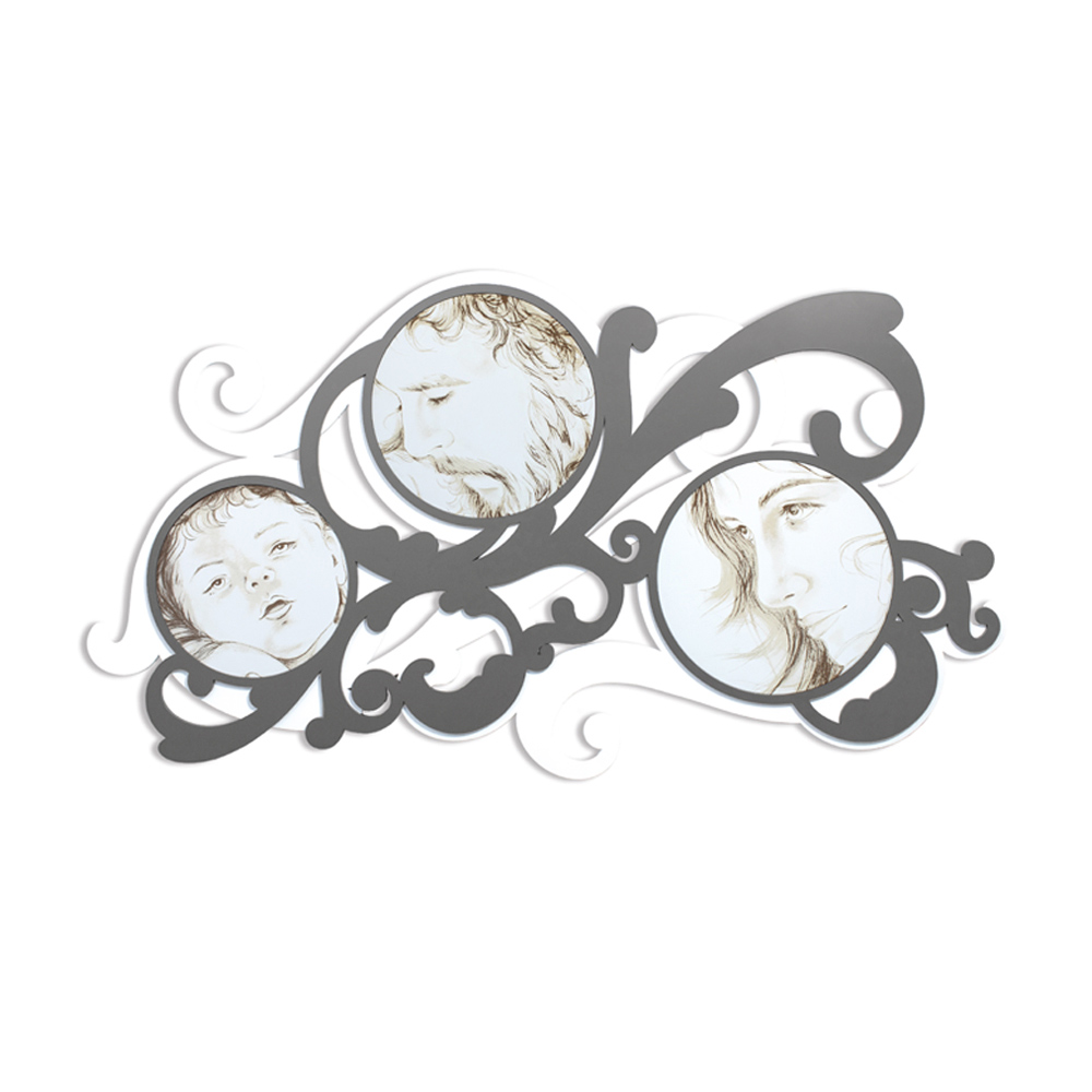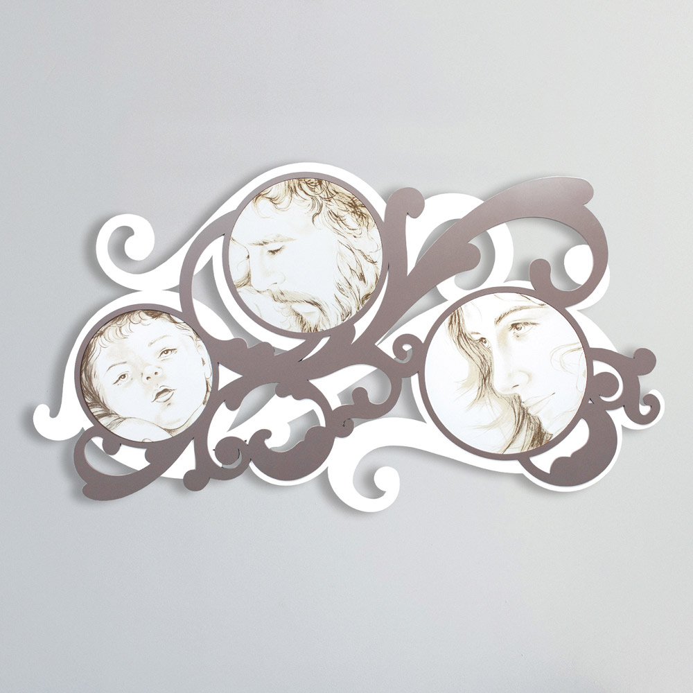 Een hoofdeinde dat de afstamming weergeeft dankzij lasermarkering, die de kenmerken van de gezichten laat zien. Matwit gelakt houten paneel met lasermarkering, een speciale techniek die een bas-reliëf op de materialen creëert. Het originele handgetekende ontwerp in combinatie met lasertechnologie geeft leven aan dit werk dat op meerdere niveaus is gegraveerd.