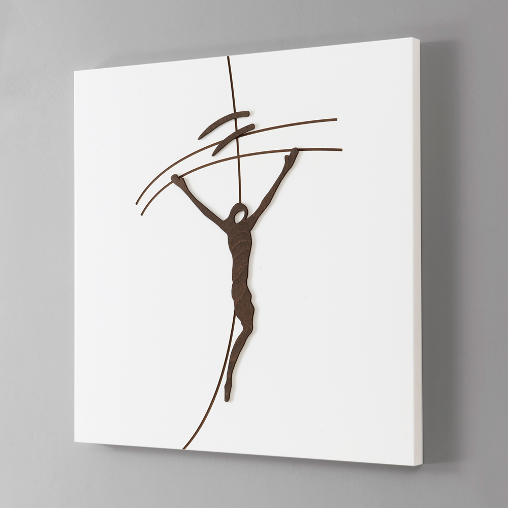 Gelakte houten afbeelding met lasergravure van het gestileerde kruis en applicatie van Jezus.