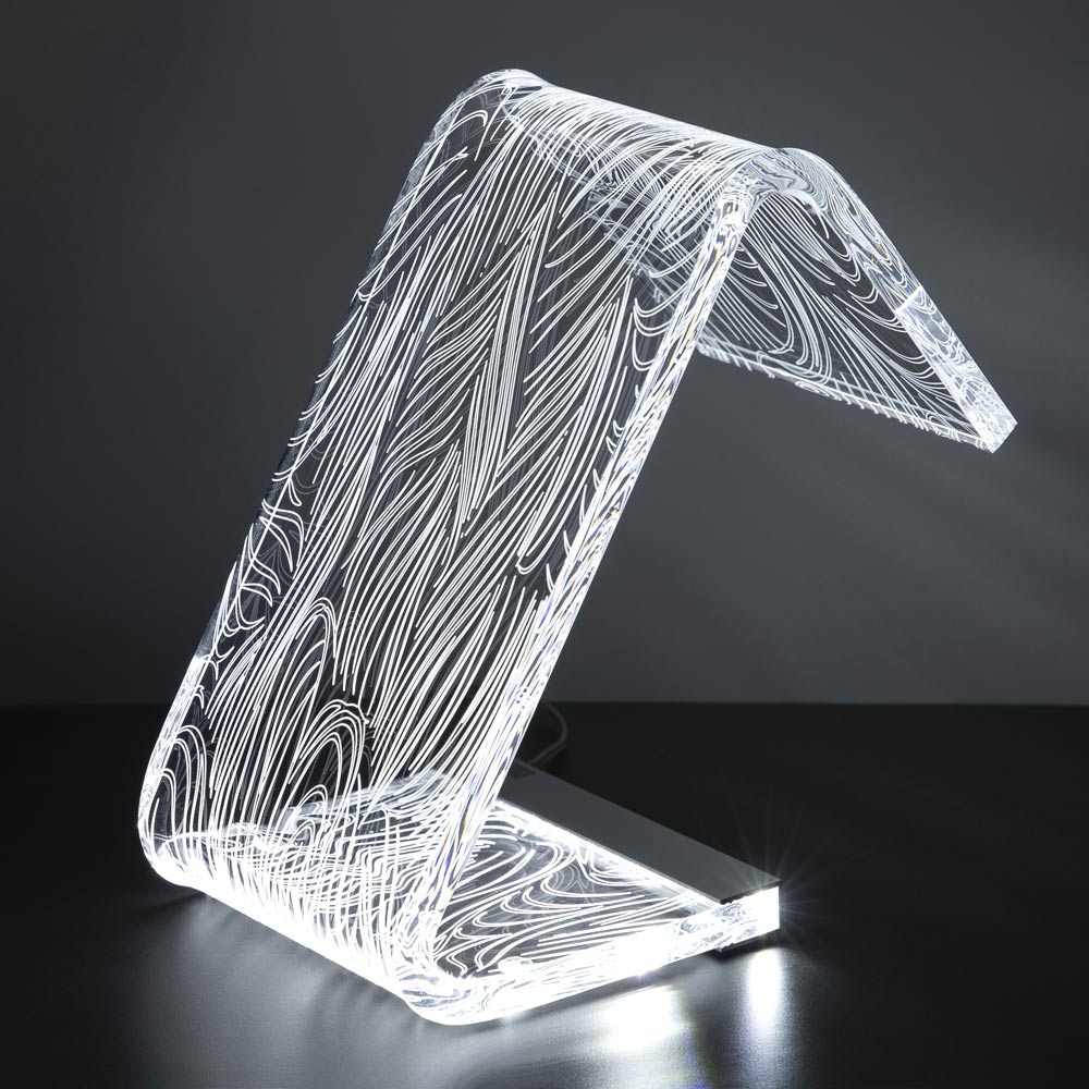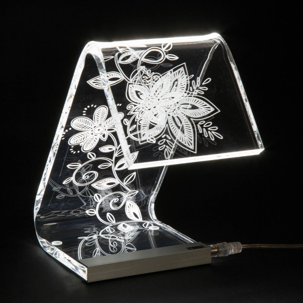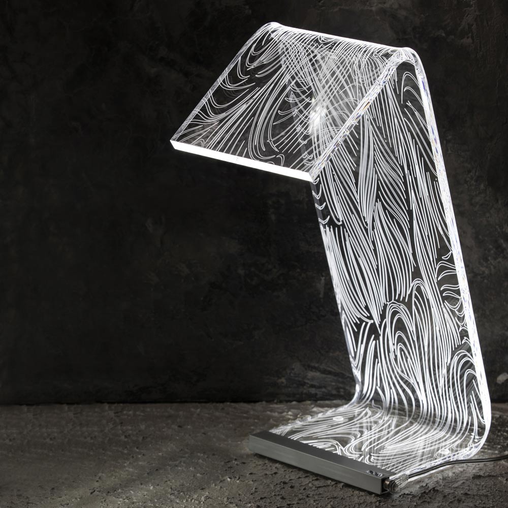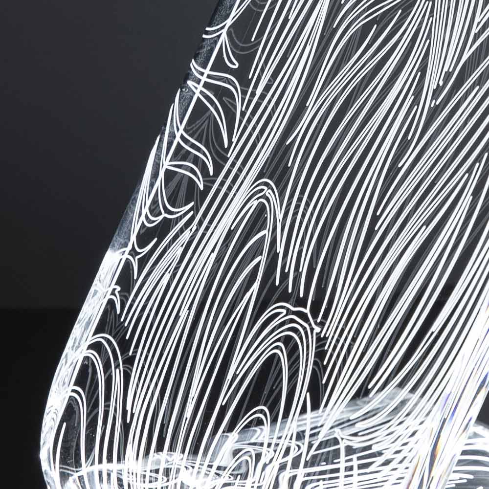 Tafellamp van transparant acrylkristal met laserdecoraties, 2 maten gemaakt in Italië.