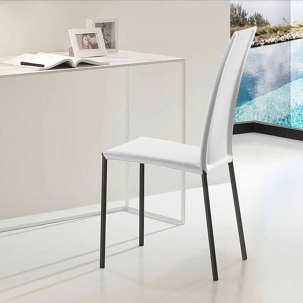 Een aanvulling met een eenvoudig en essentieel ontwerp, verrijkt en vervolledigd door de prachtige combinatie tussen het vleugje klasse van de bekleding en de onbetwiste moderniteit van het geverfde metaal. De hoge rugleuning geeft de stoel een langwerpige vorm en verrijkt deze met een bijna koninklijke esthetiek, mede dankzij een vleugje elegantie en verfijning die wordt gegeven door de prachtige textuur van het leer, een kostbaar en hoogwaardig materiaal. De talrijke beschikbare kleuren en de essentie van de vormen maken het ook tot een bijzonder veelzijdige inrichtingsoplossing die in staat is om een perfecte harmonie te creëren met de omringende elementen en zo de omgeving te karakteriseren.