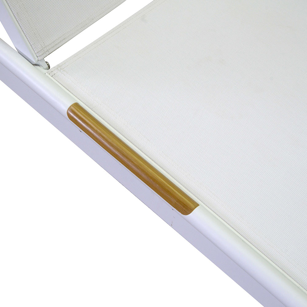 Het strakke, minimalistische ontwerp wordt geaccentueerd met accenten van polywood op de armleuningen, die een vleugje warmte en verfijning toevoegen. Met zijn strakke lijnen en neutrale kleur past het perfect in elke buitenomgeving, van het zwembad tot het terras.