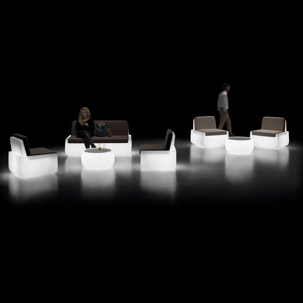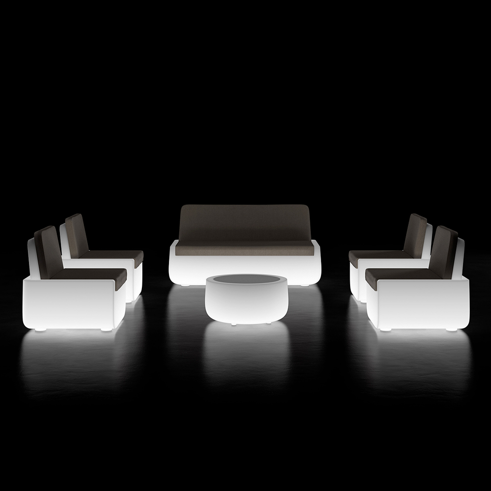 Lage design salontafel voor buiten in polyethyleen met HPL-blad en Made in Italy LED-lamp.