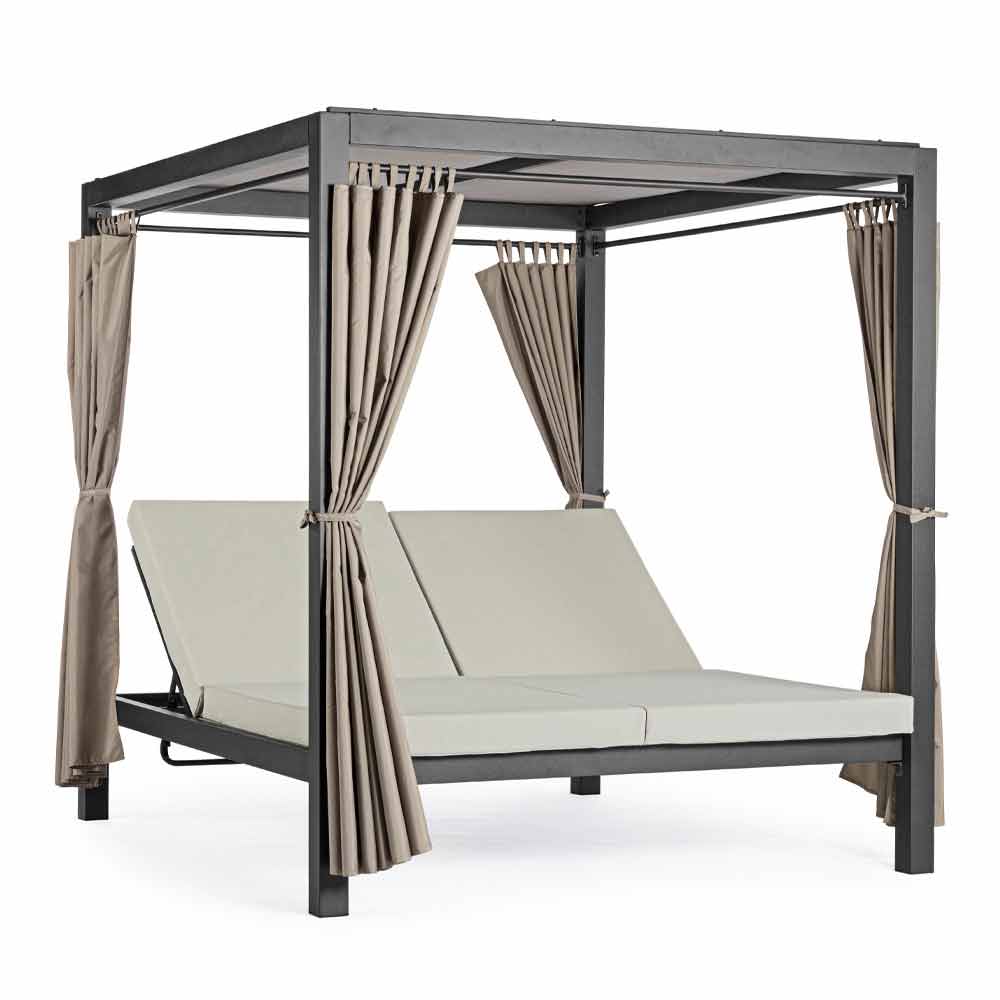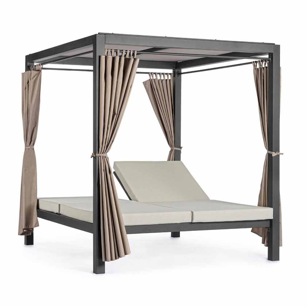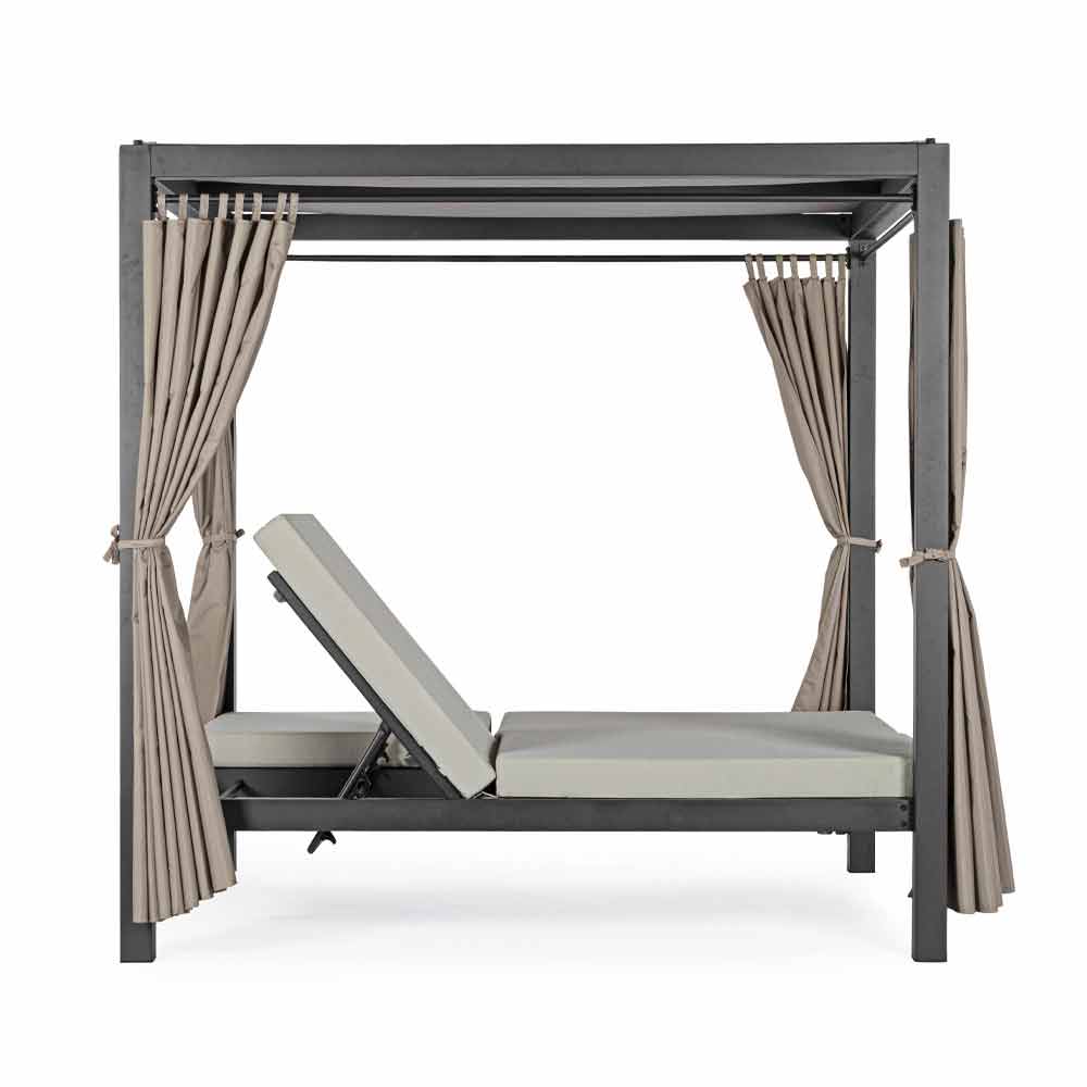 Outdoor ligbed van aluminium en textileen met verstelbare rugleuningen.