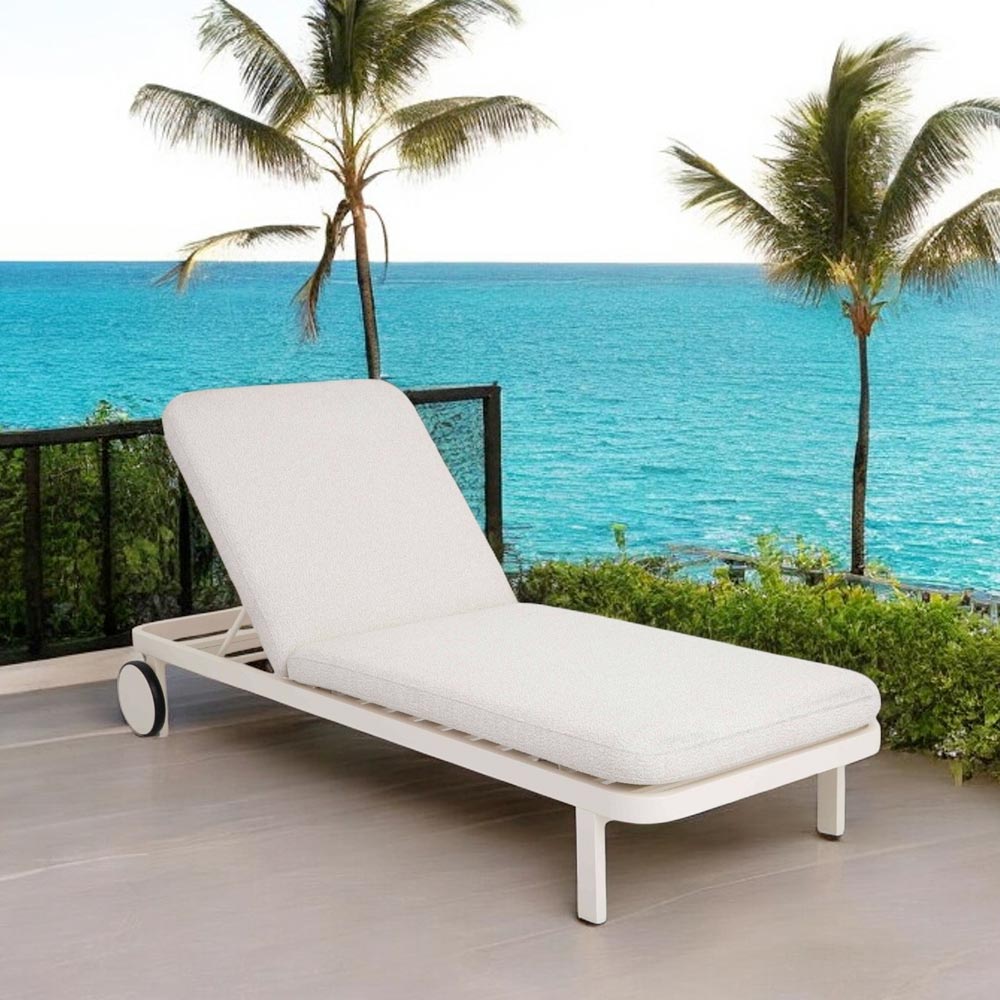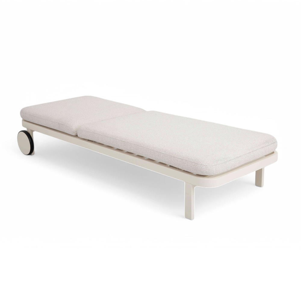 Het minimalistische ontwerp wordt verrijkt door doordachte details, zoals de geïntegreerde wielen die het gemakkelijk maken om het te verplaatsen waar u maar wilt, na uw momenten van ontspanning in de zon of schaduw. De gewatteerde matras, bedekt met weerbestendige stof, garandeert buitengewoon comfort en duurzaamheid na verloop van tijd.