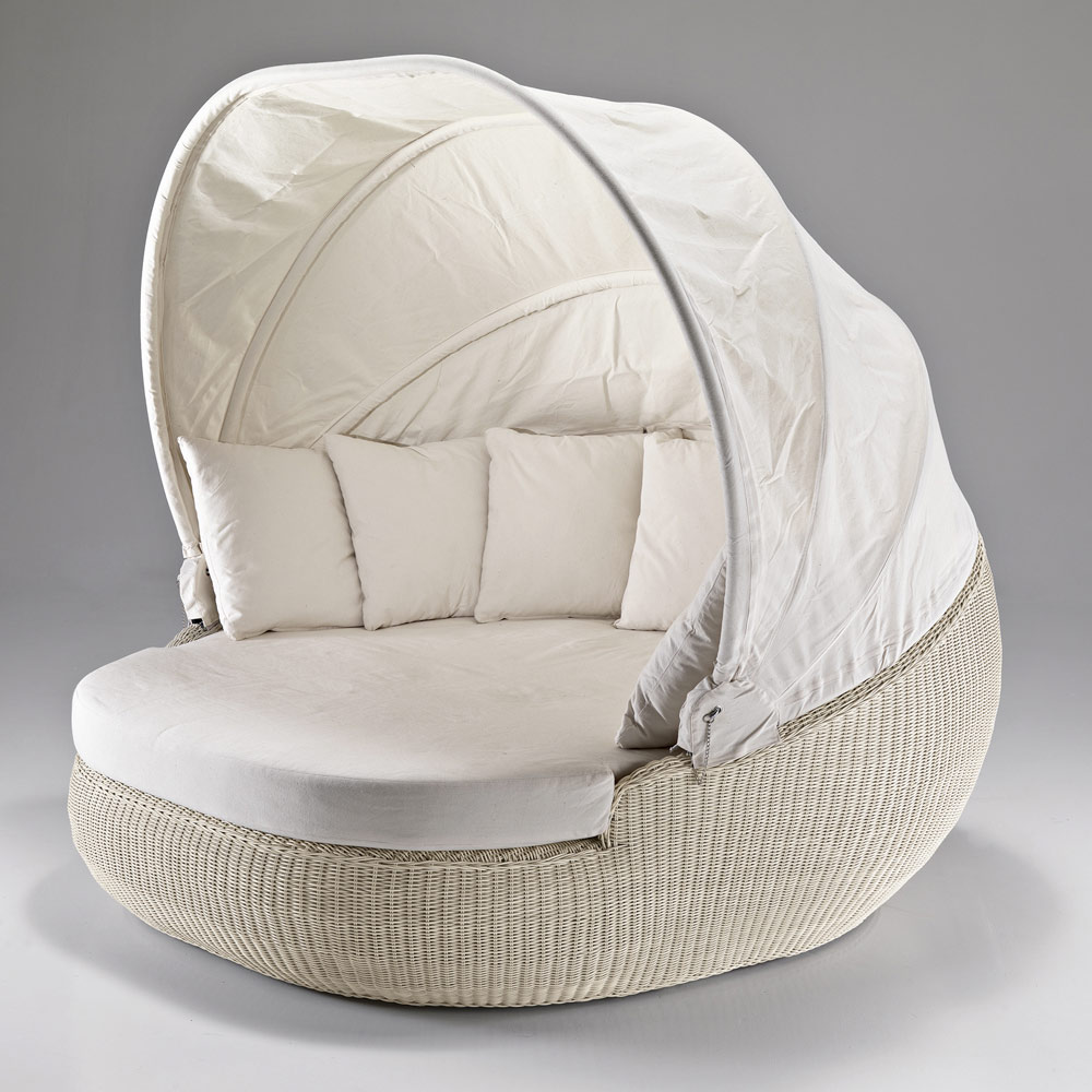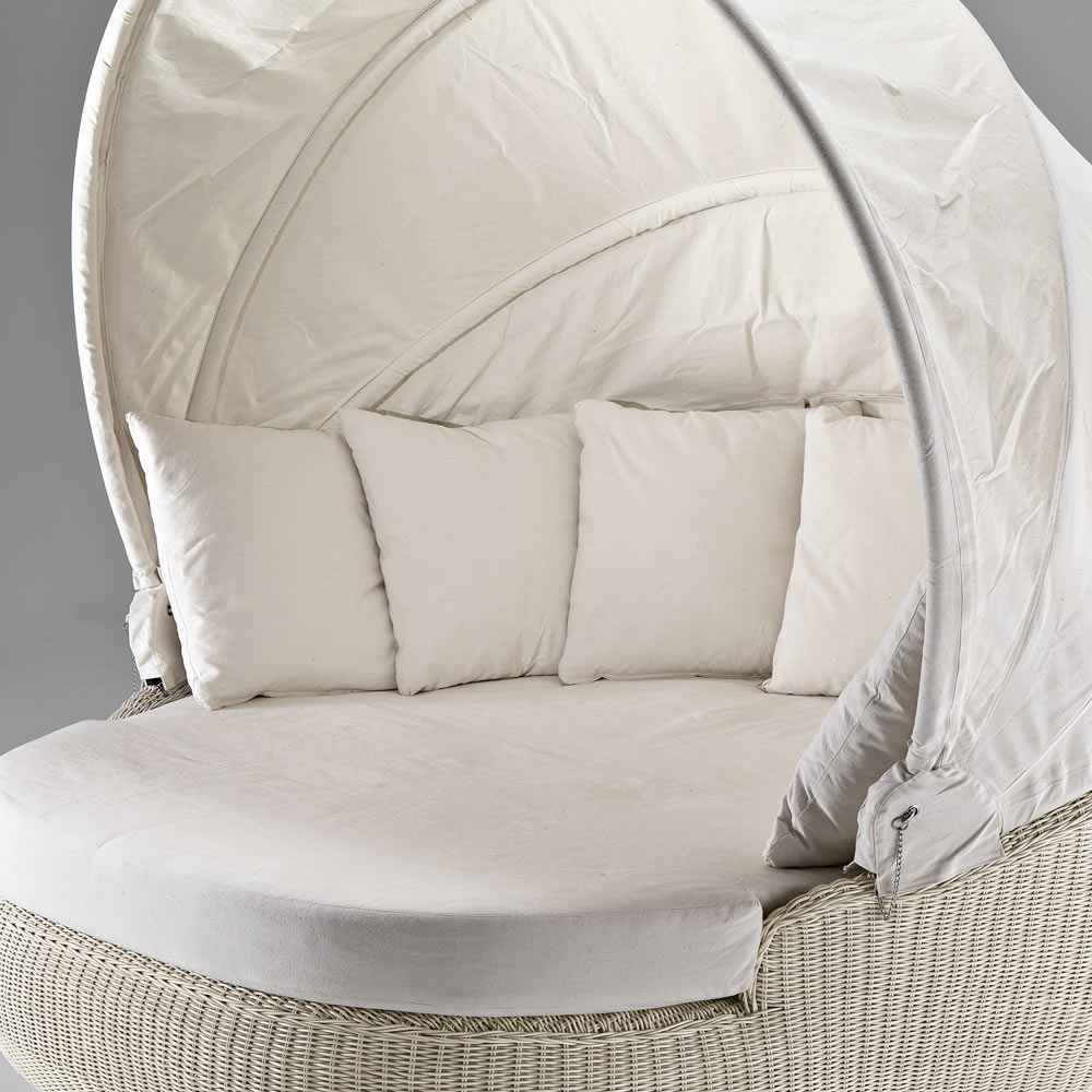 Dit ligbed wordt gekenmerkt door zijn ronde ontwerp en volledige weving. De ronde en golvende volumes passen perfect bij de grote zitting waardoor je optimaal kunt ontspannen. De openende en sluitende kap maakt deze lounger origineel en praktisch, want zo kun je op het heetst van de dag genieten van zowel zonlicht als schaduw.