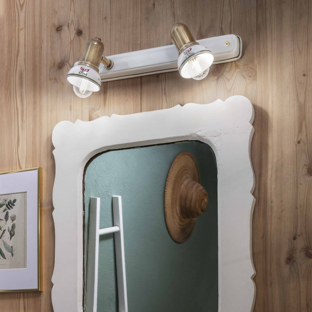 Lineaire wandlamp 2-lichts in messing en handbeschilderd keramiek, gemaakt in Italië door Ferroluce.