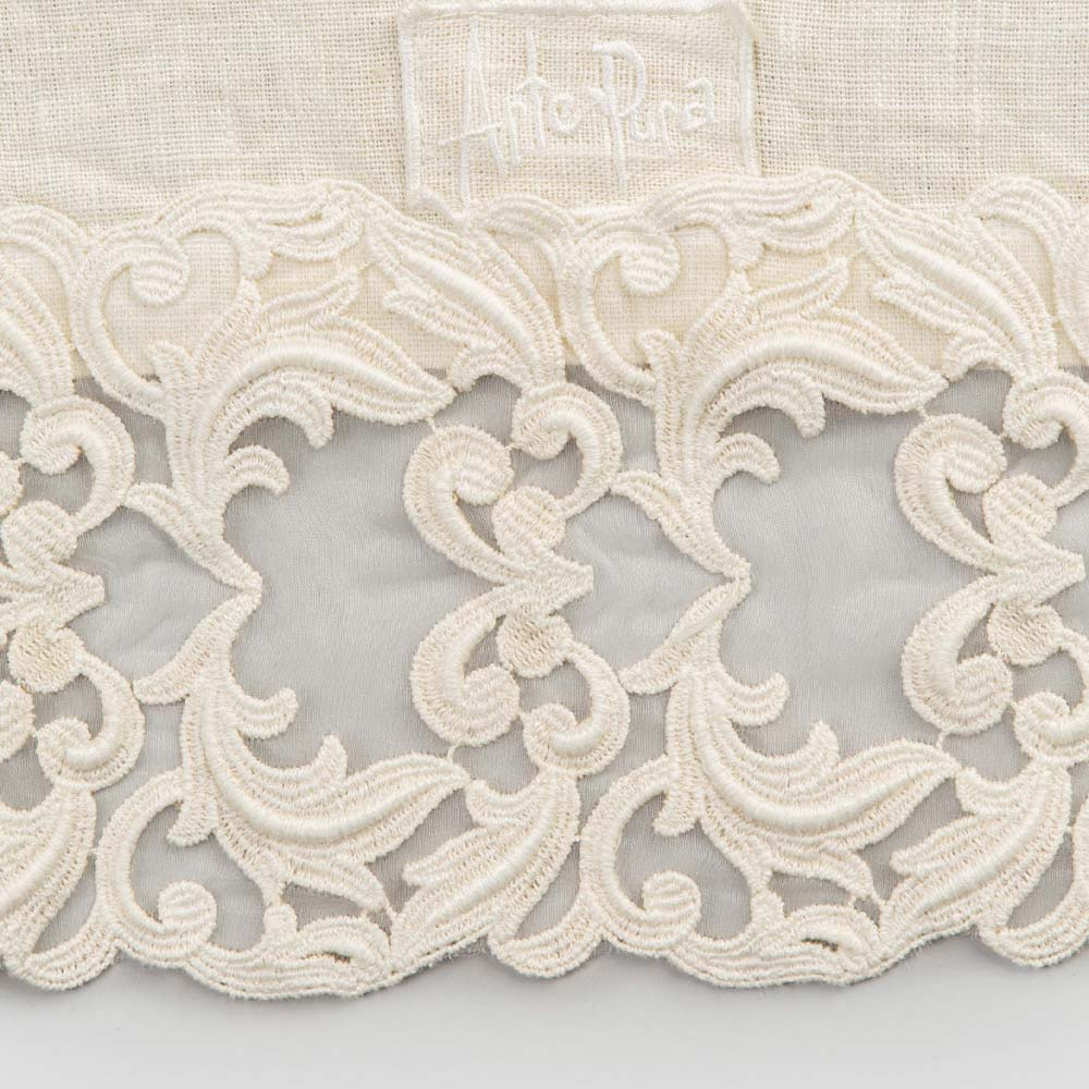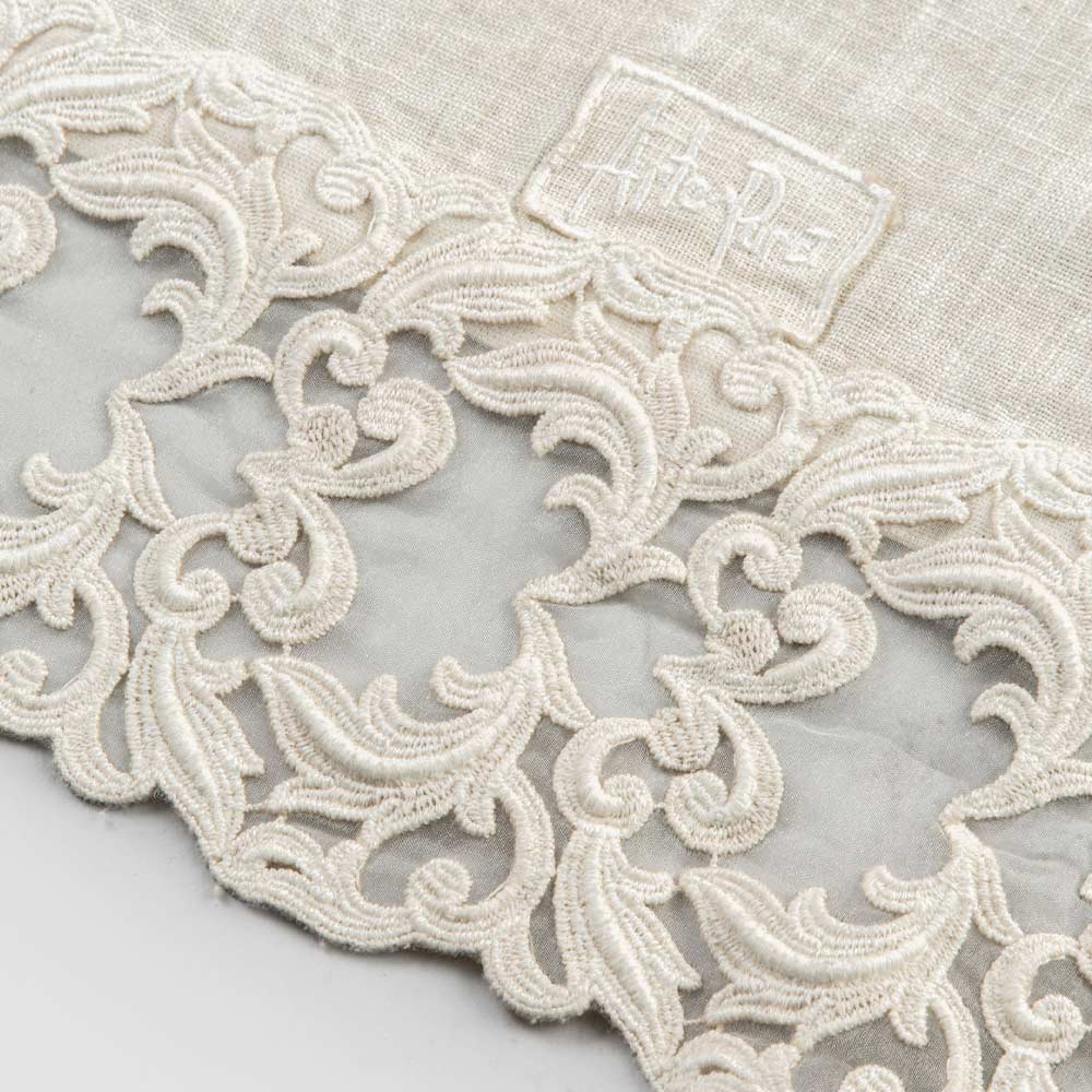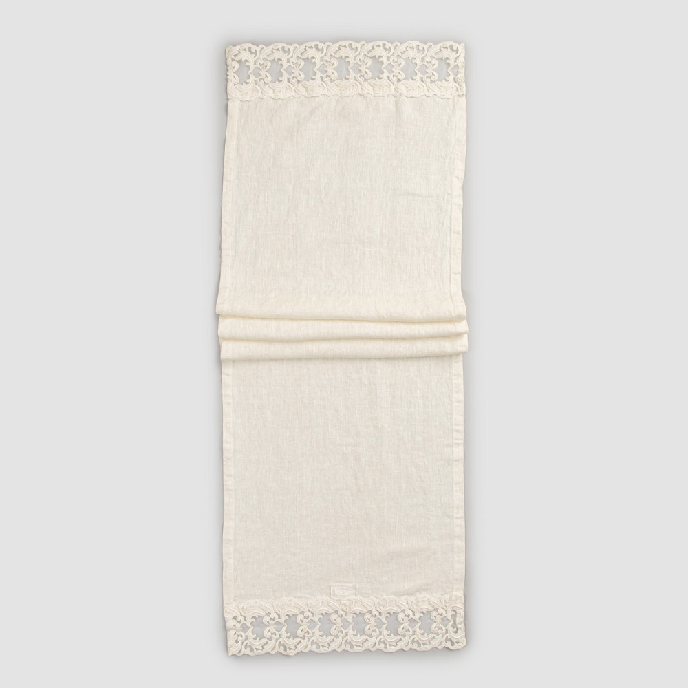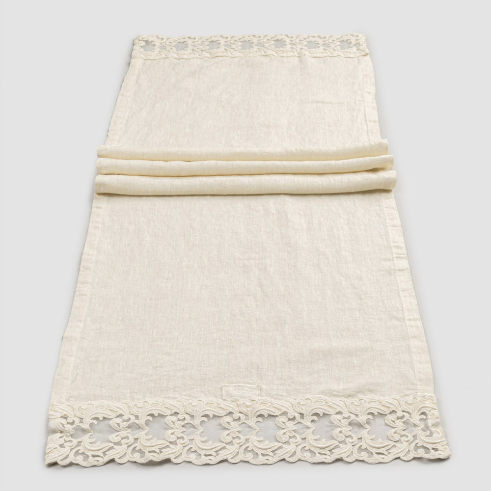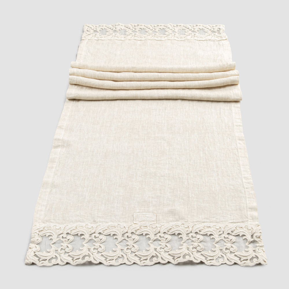 Zware linnen tafelloper met kant en omgeslagen rand, luxe made in Italy.