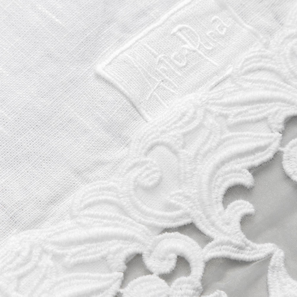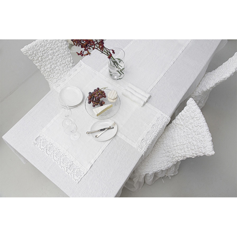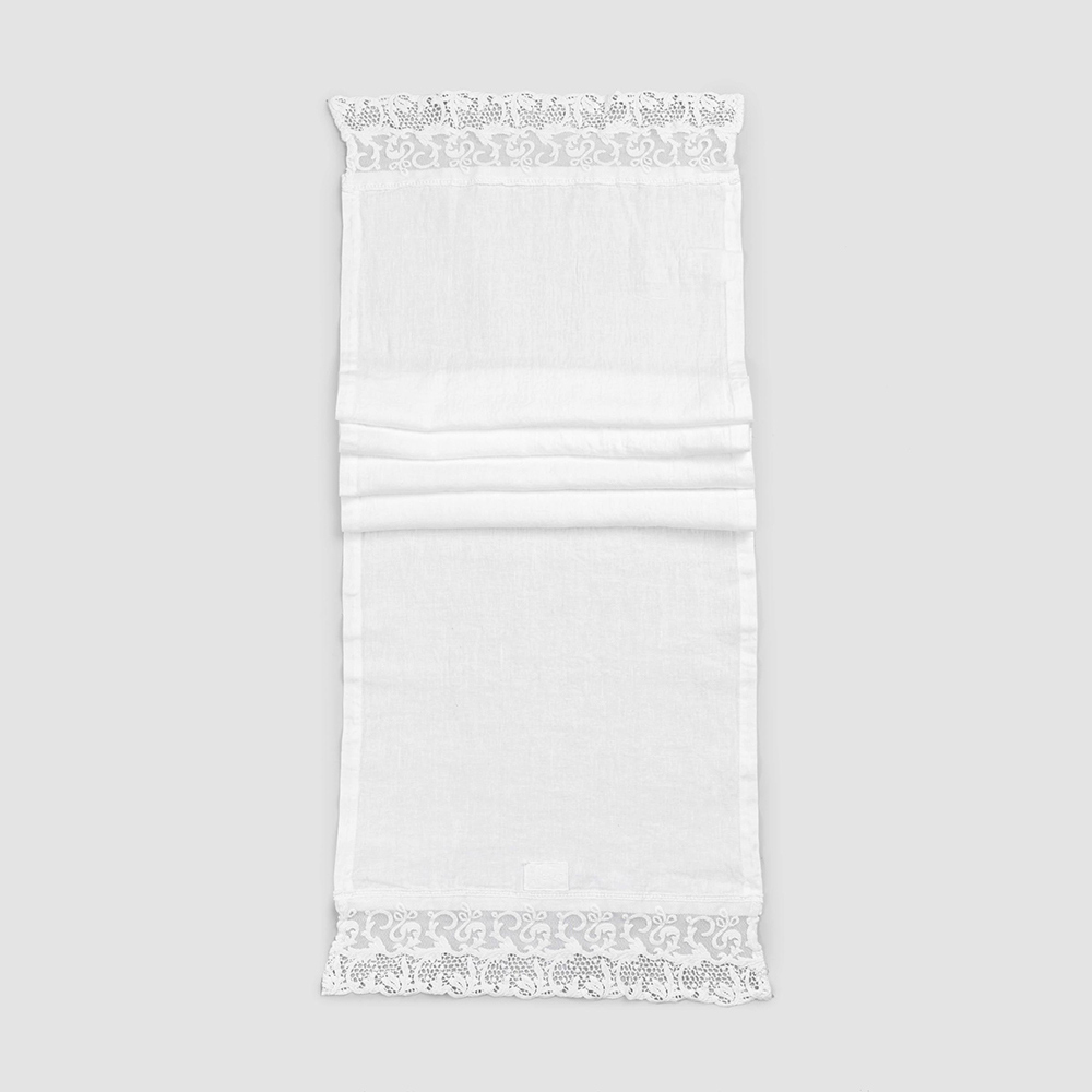Zuiver wit linnen tafelloper met twee varianten van kantdecoratie, elegant en luxe design gemaakt in Italië.