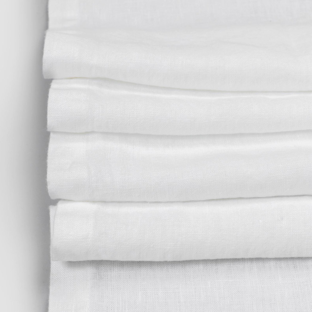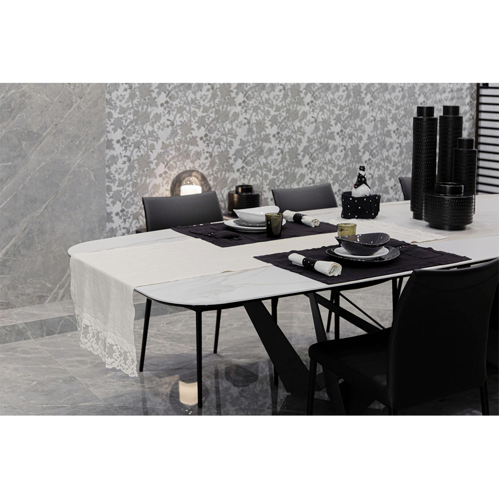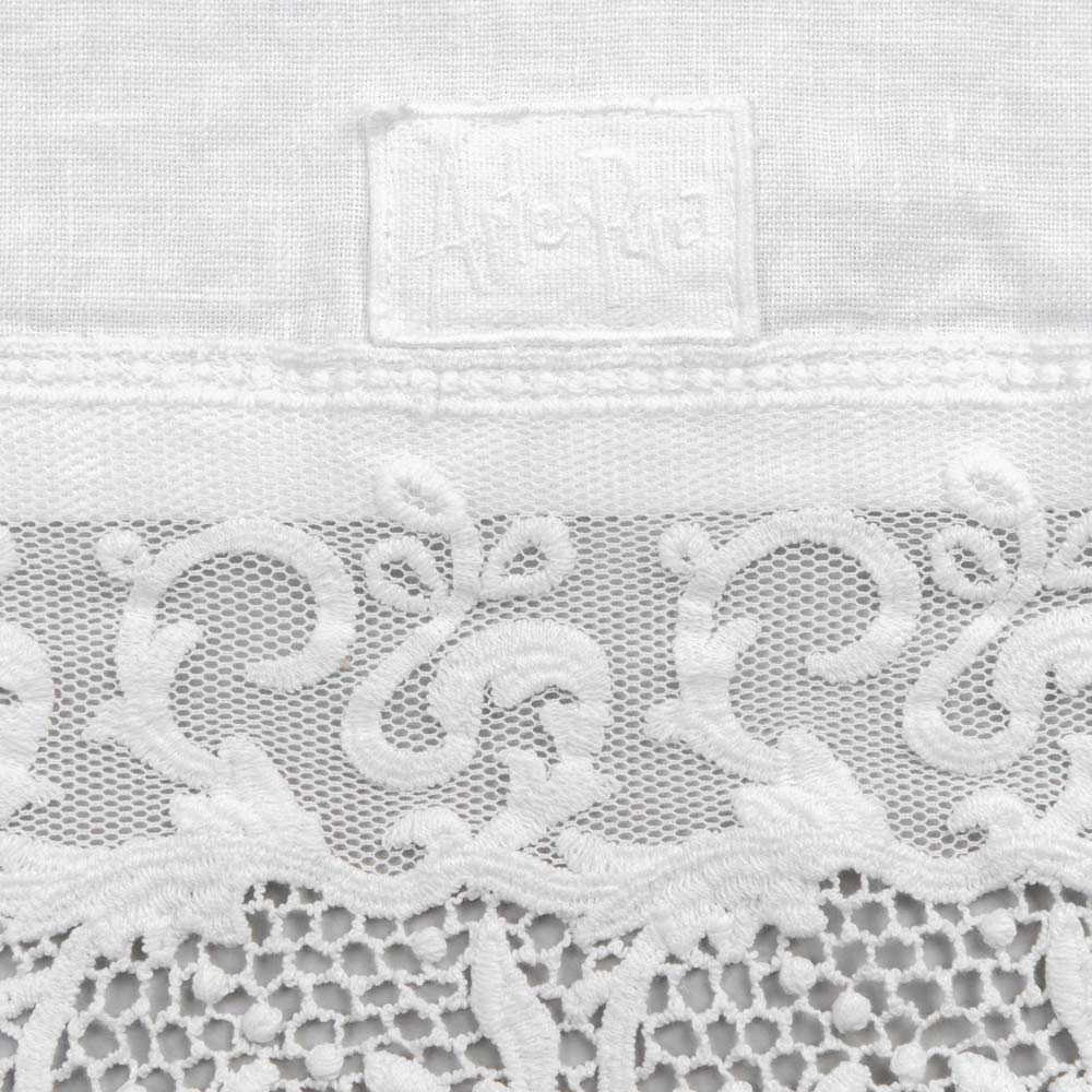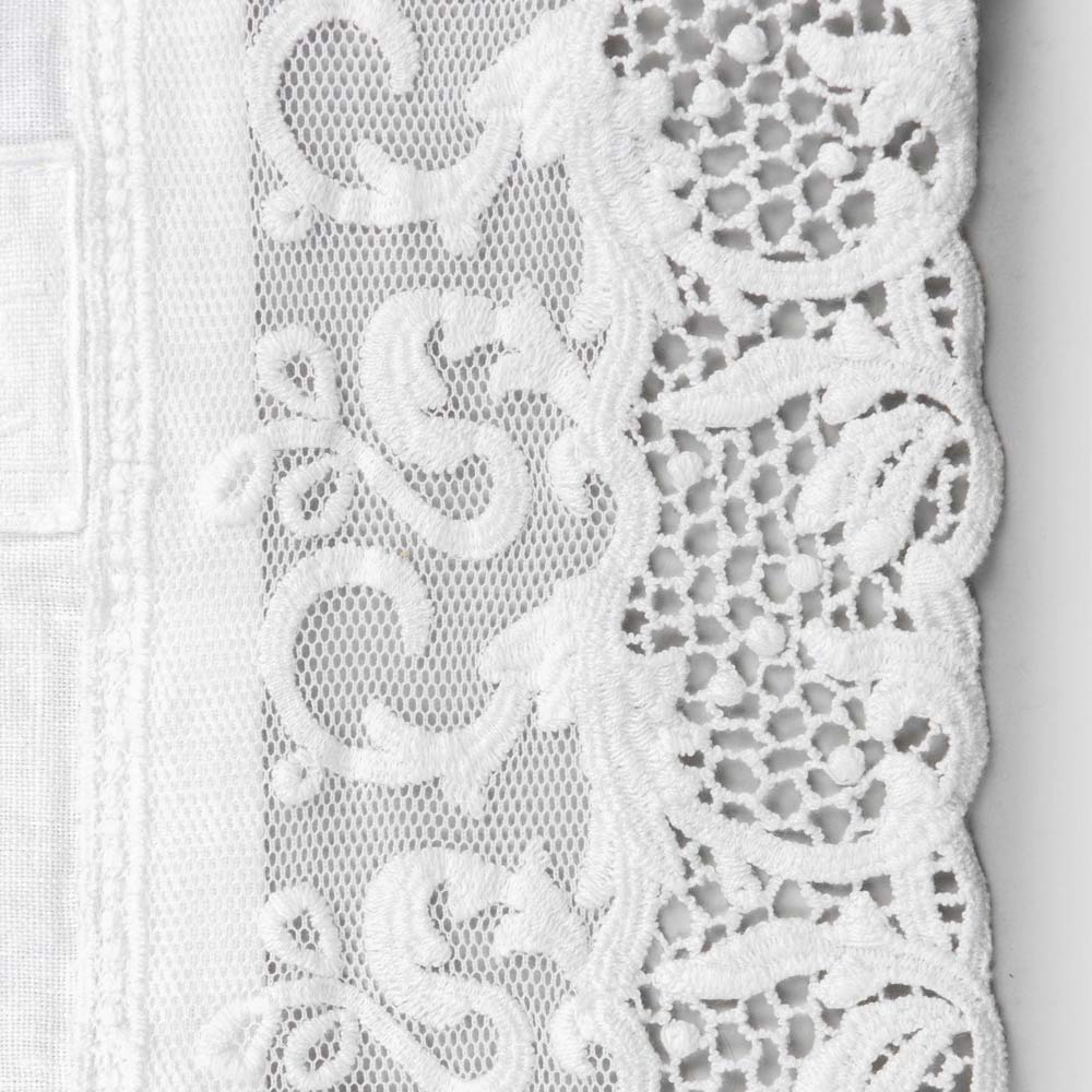 Zuiver wit linnen tafelloper met twee varianten van kantdecoratie, elegant en luxe design gemaakt in Italië.