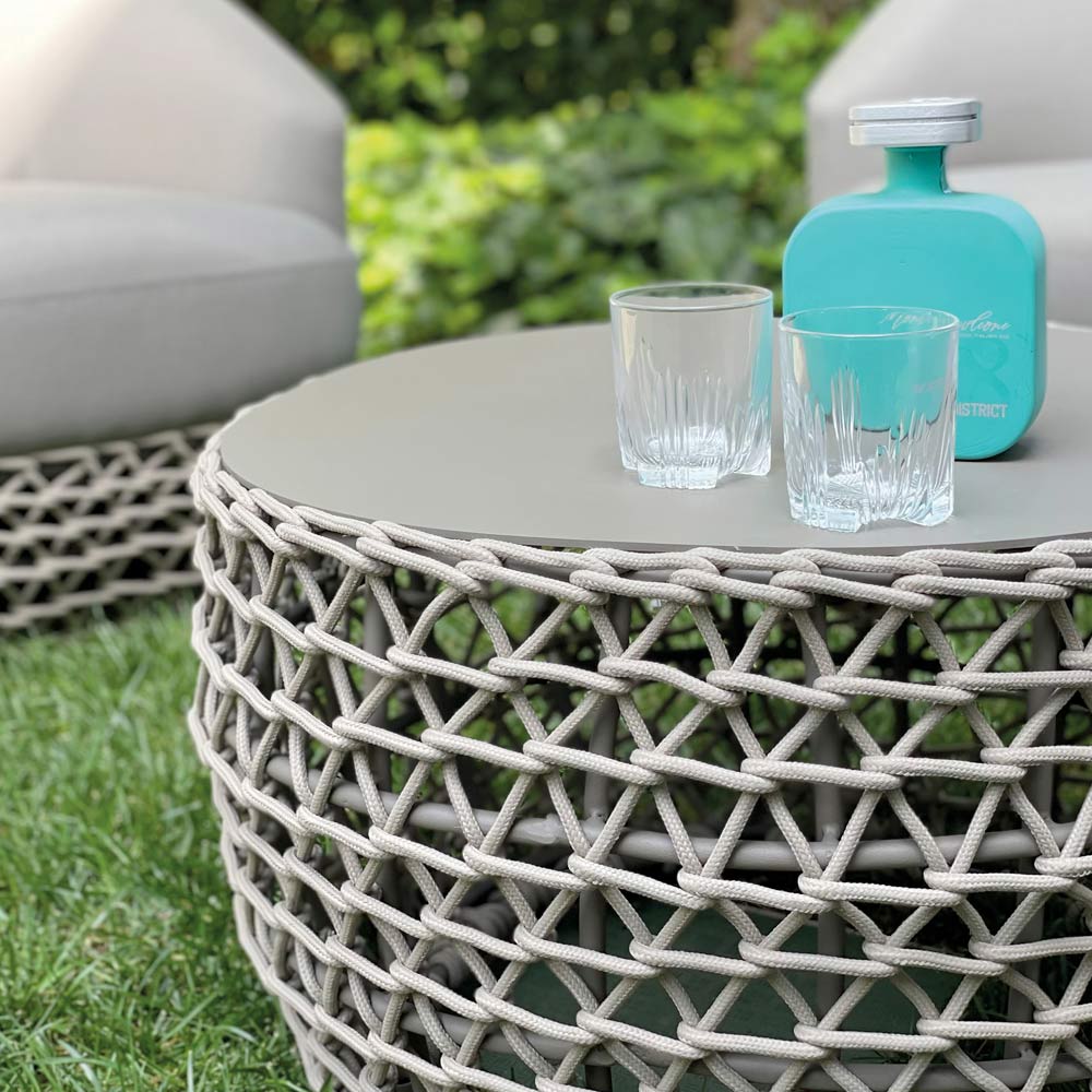 De gevlochten basis biedt een aangenaam materiaal en visueel contrast, wat de set een vleugje hedendaags vakmanschap geeft.