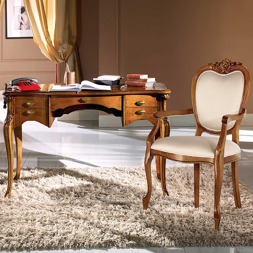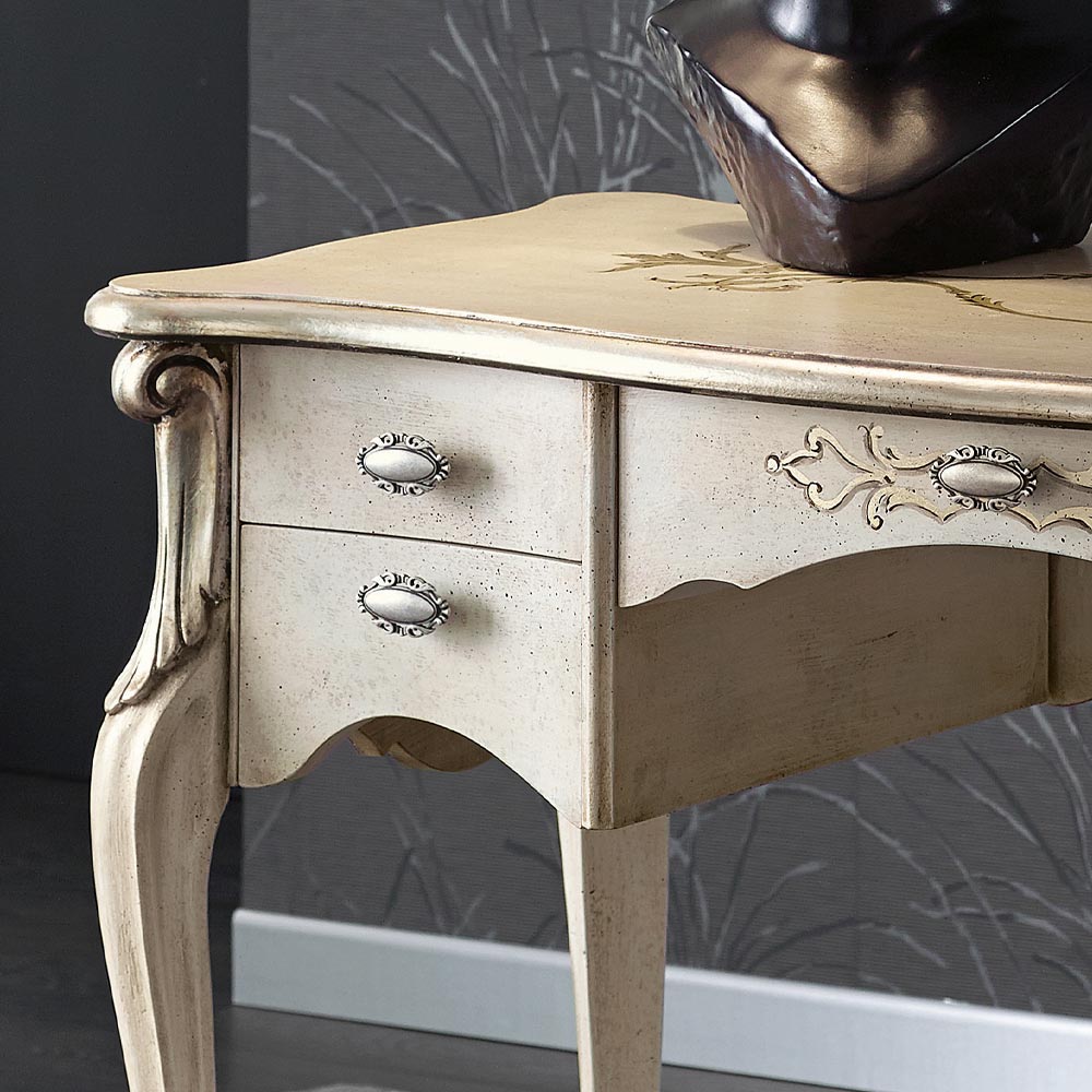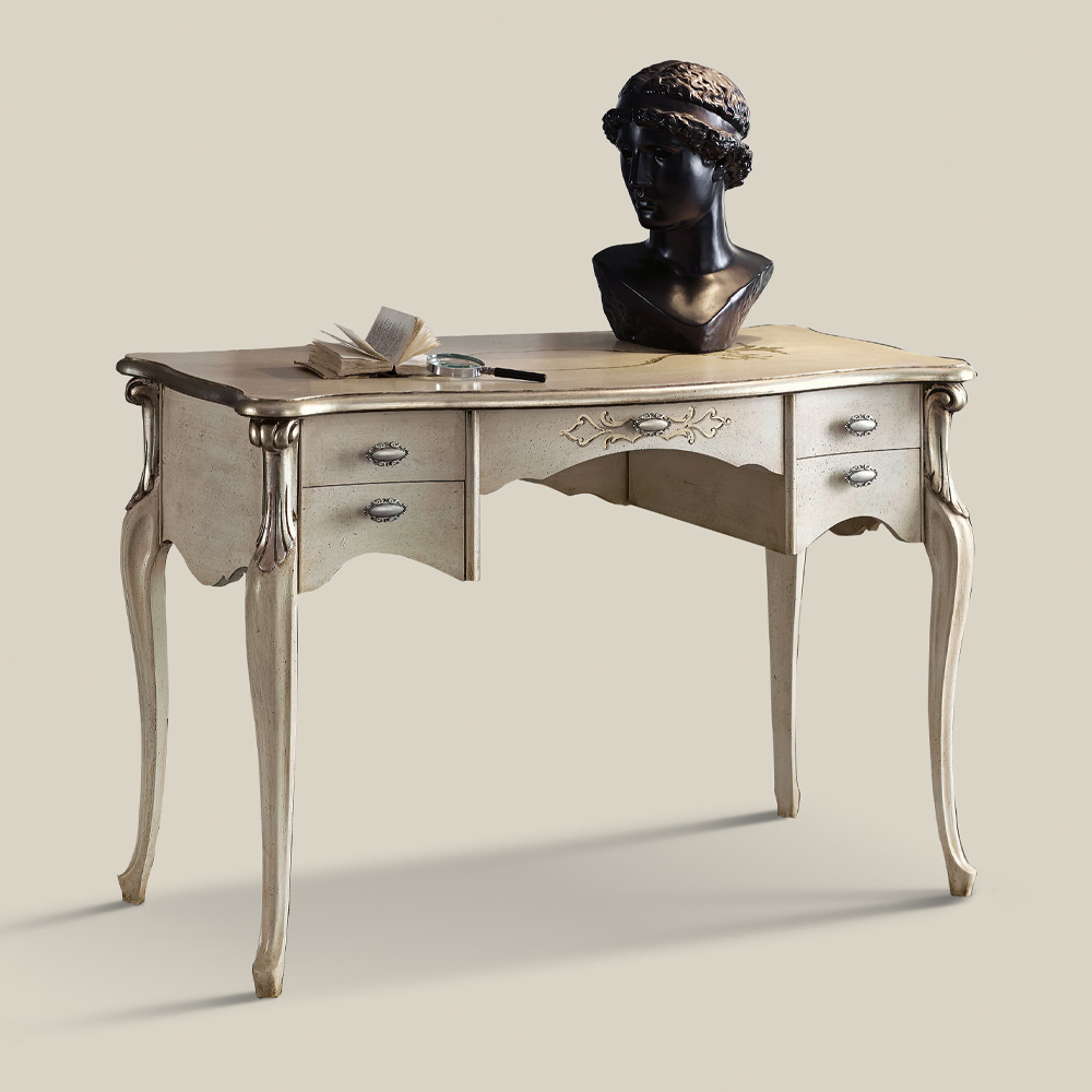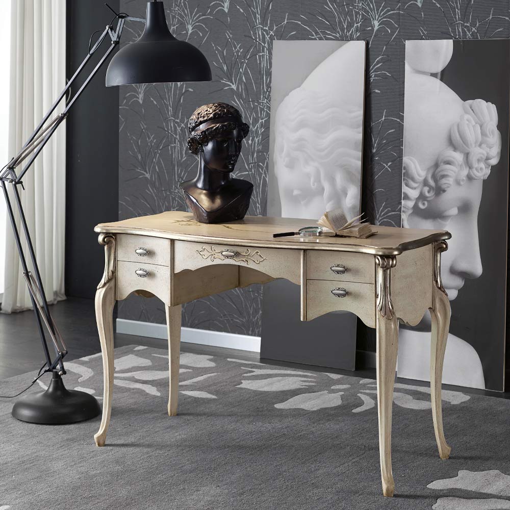 bureau in klassieke stijl is perfect om een woonkamer, studeerkamer of slaapkamer stijlvol en elegant in te richten. Het is gemaakt van hout in Bassano walnoot of antiek witte afwerking en heeft 5 praktische lades. Ook is het mogelijk om te kiezen tussen de uitvoering met de deur die naar rechts of naar links kan worden geopend.