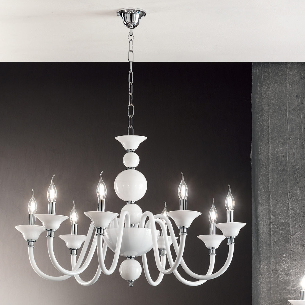 klassieke en luxueuze ontwerp bestaat uit boven elkaar geplaatste bollen voor de lichtbehuizing, die een glimp van de chroommetalen kern mogelijk maken, en uit 8 gebogen armen , volledig gemaakt van
