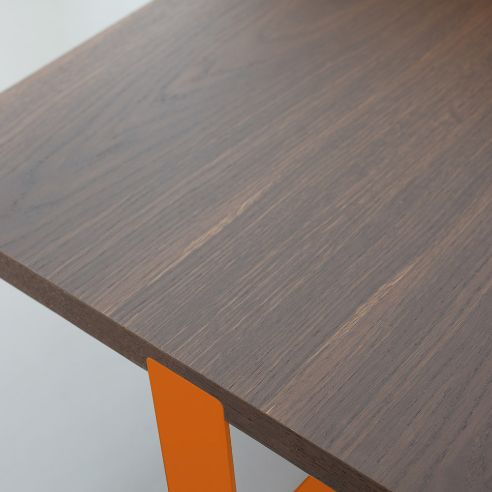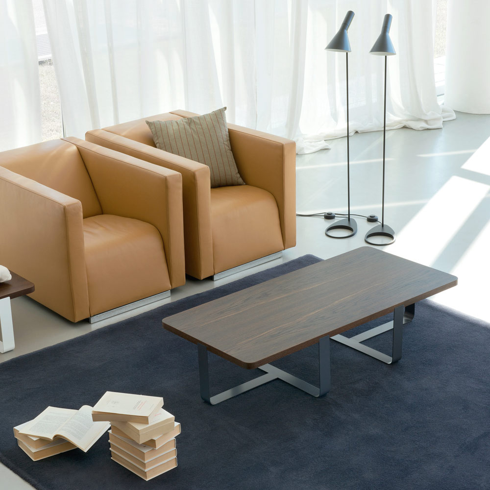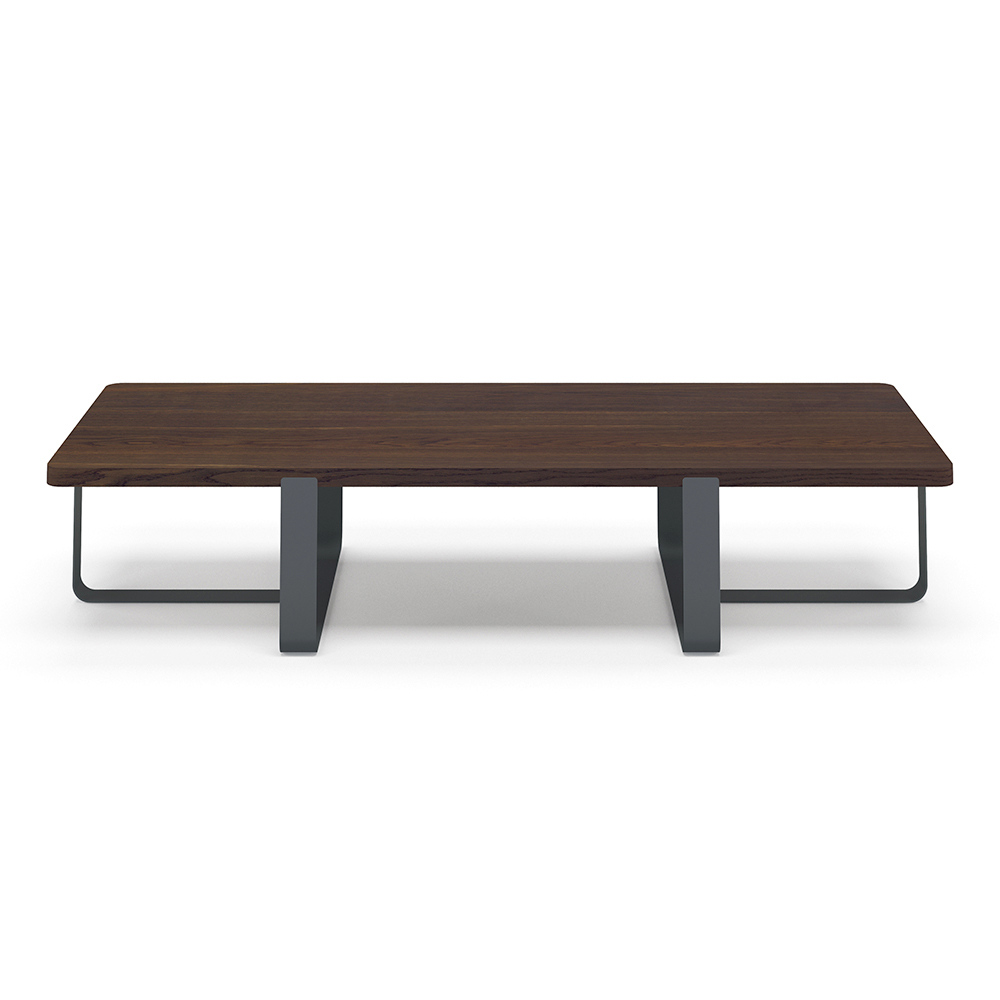Lage salontafel voor woonkamer met rechthoekig fineer blad en gekleurd metalen onderstel, luxe made in Italy.