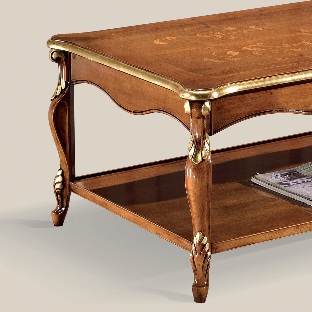 Rechthoekige salontafel van Bassano walnoot en antiek goud, met ingelegd blad en praktische plank.