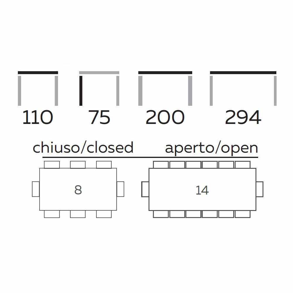 Moderne eettafel uitschuifbaar tot 294 cm met steengoed blad, hoogwaardig Made in Italy product.