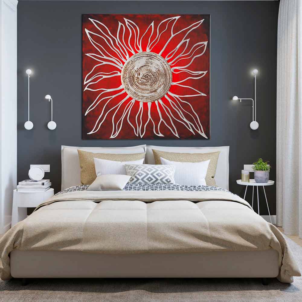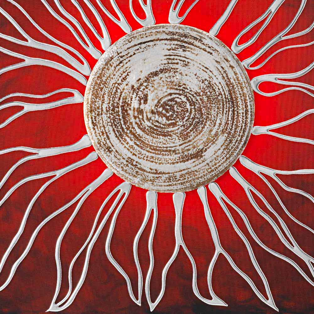 Hand-verfraaide canvasstructuur met rode achtergrond en in reliëf gemaakt materieel werk, centraal element en zilveren bladstralen.