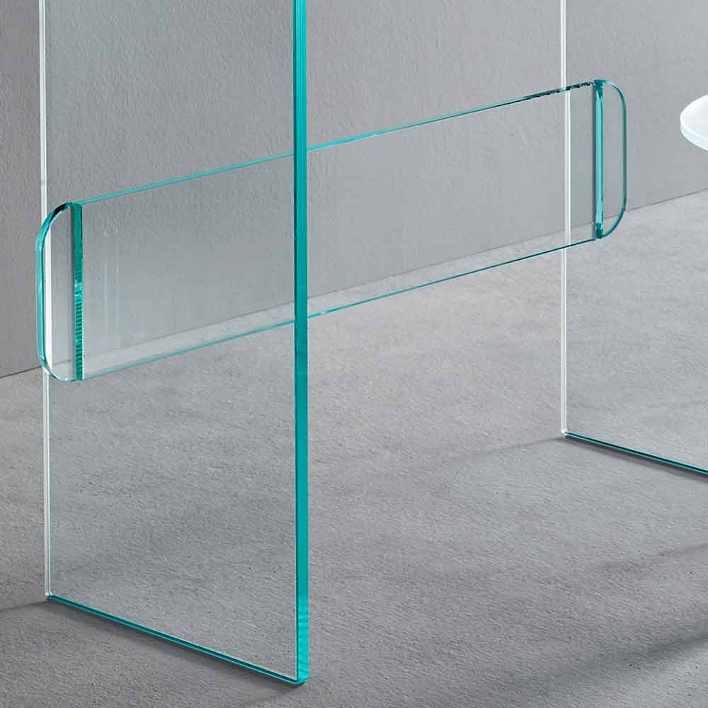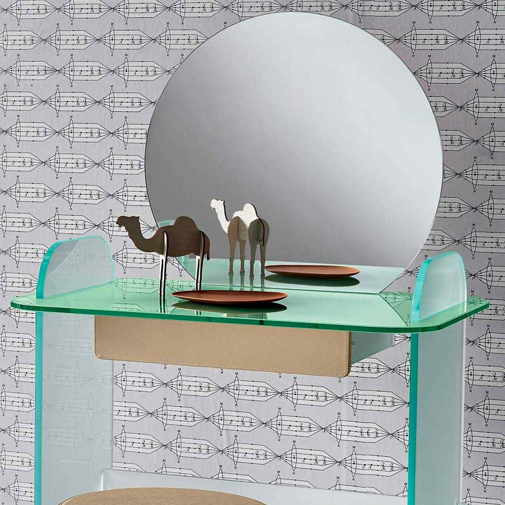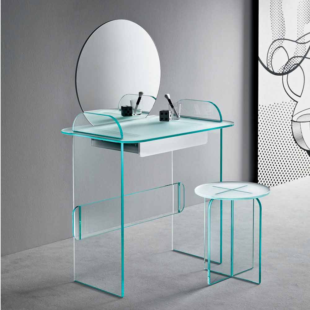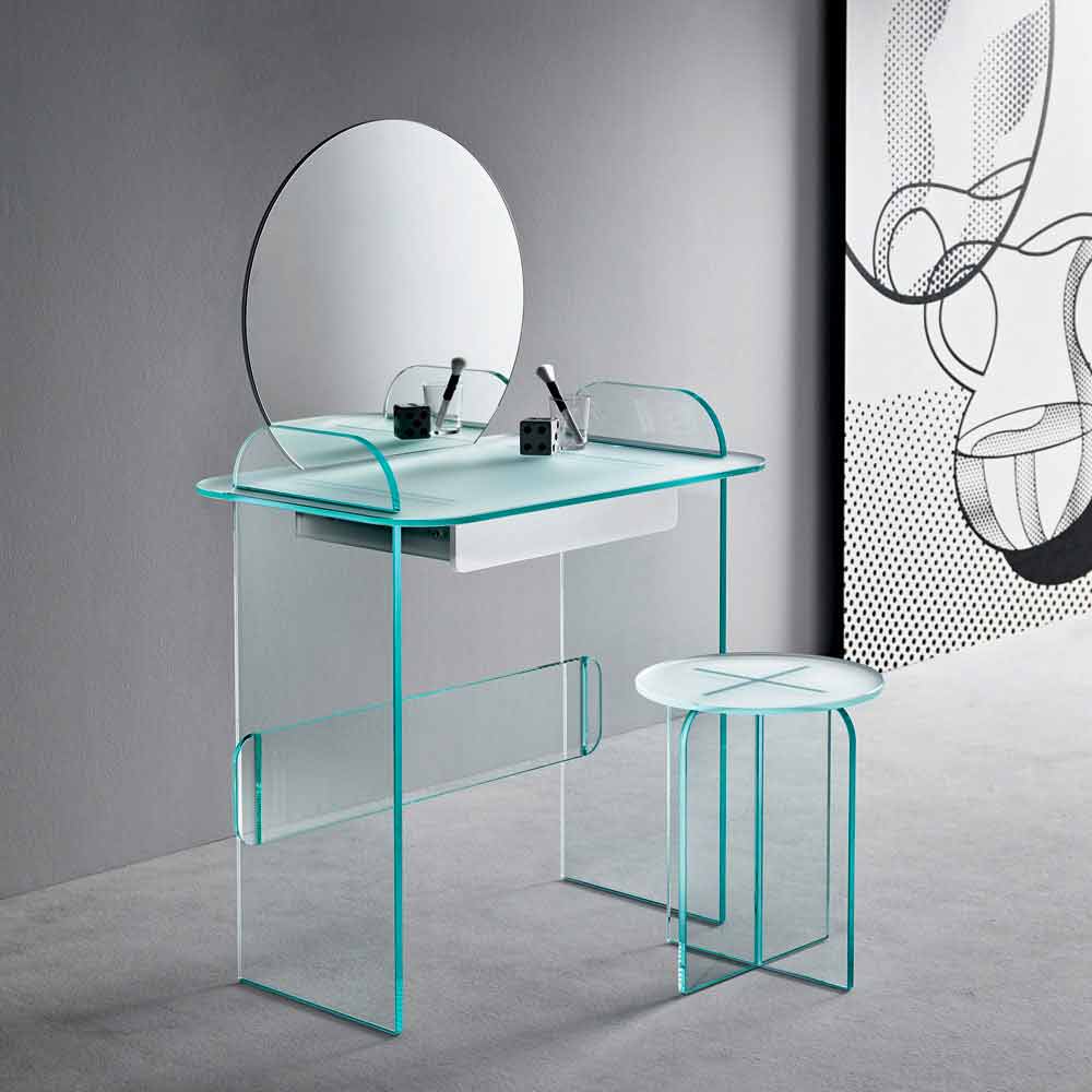 Symbool van vrouwelijkheid en verfijning, deze kaptafel heeft een structuur volledig gemaakt van glas, verkrijgbaar in drie afwerkingen en een uittrekbare lade verkrijgbaar in mat wit hout of bekleed met beige leer.