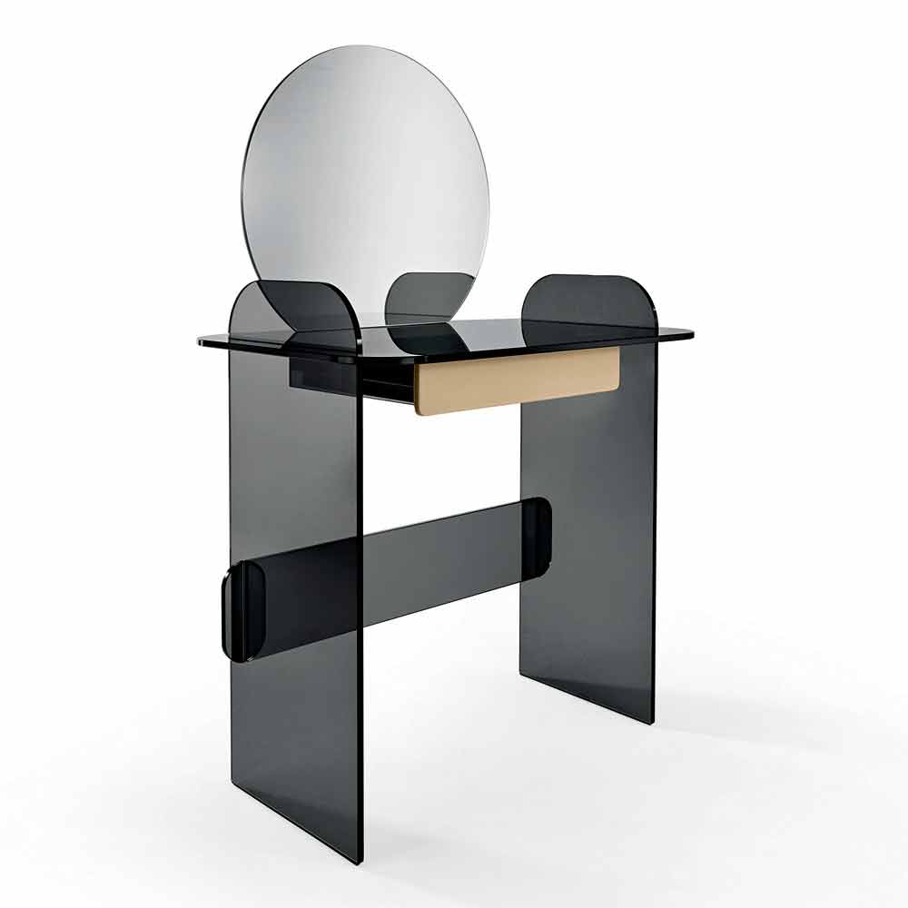 Kaptafel met spiegel en lade in extra helder, gerookt of groen glas gemaakt in Italië.