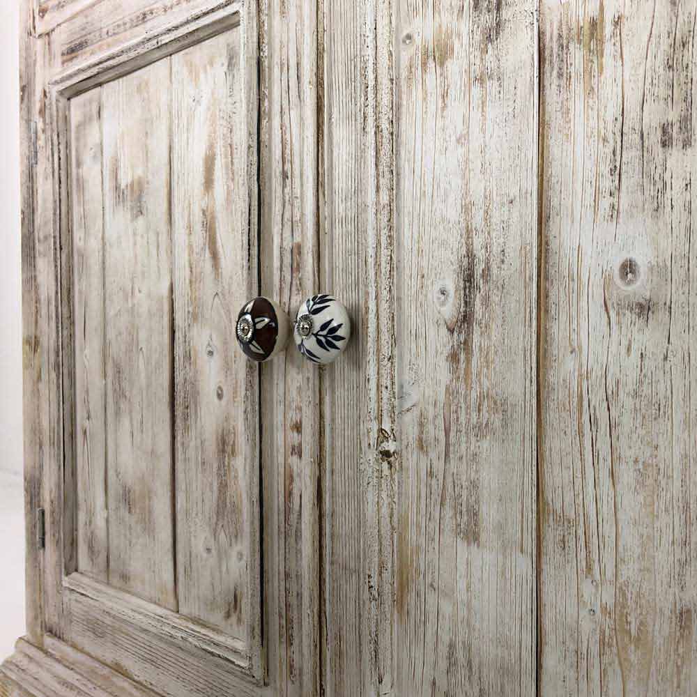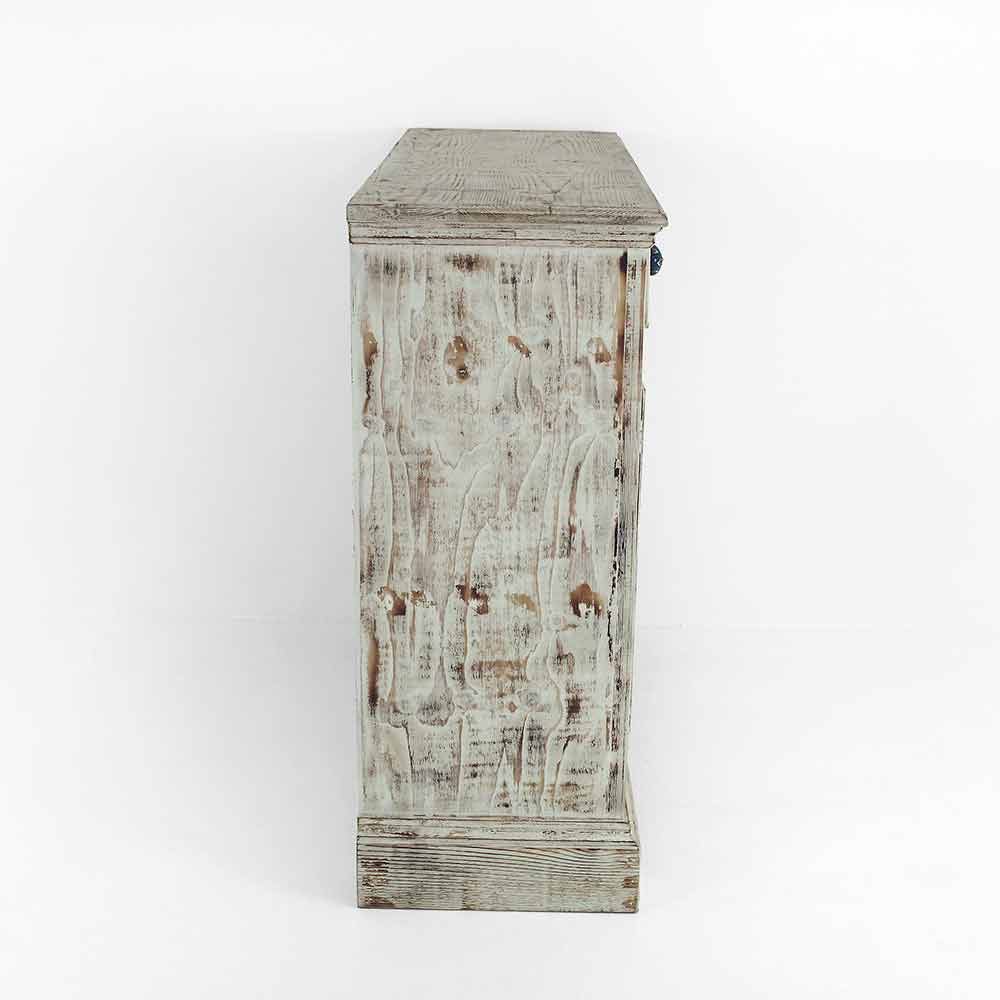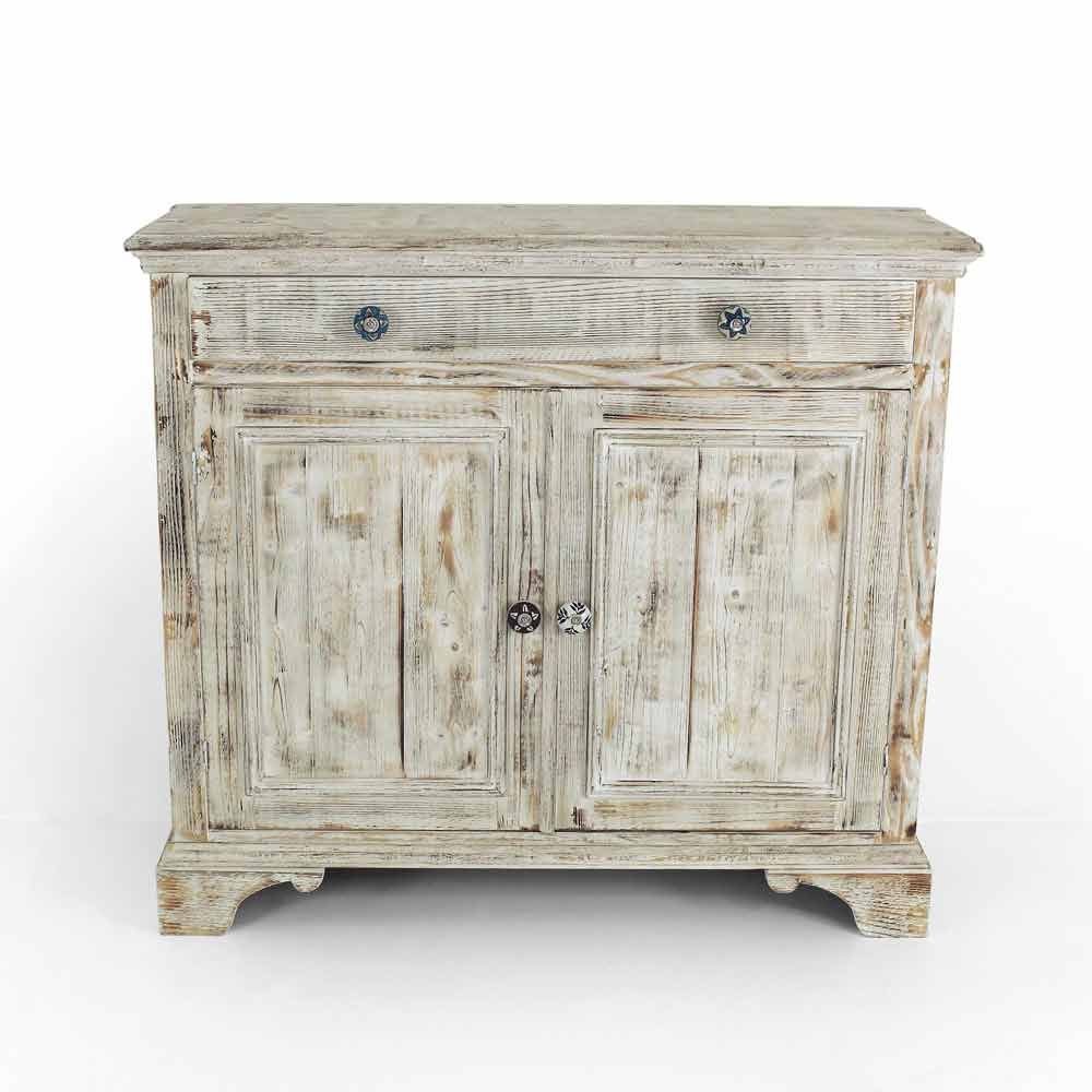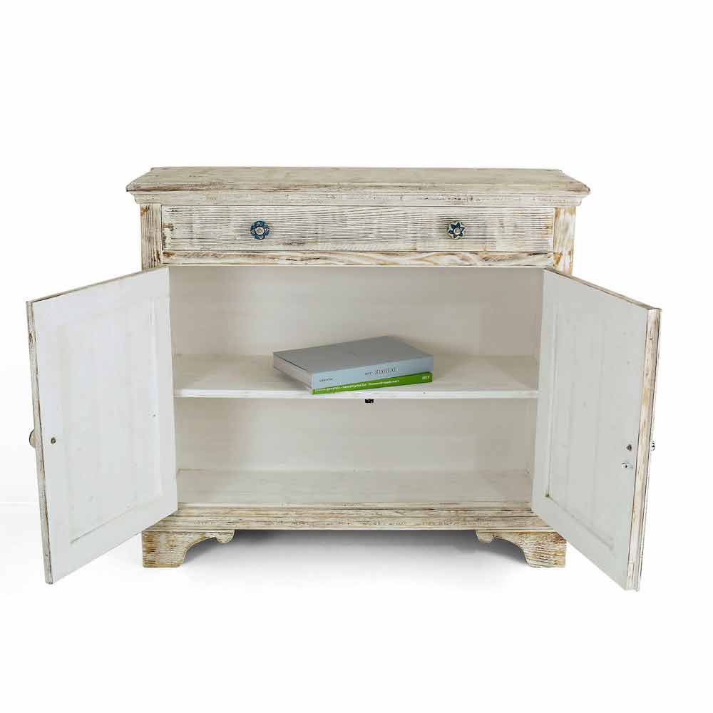 Dressoir van massief dennenhout, volledig handgemaakt in Italië en gekenmerkt door de prachtige vlamverbrande, gevilde afwerking die de specifieke nerf van het hout benadrukt die het product uniek maakt. Het dressoir wordt vervolgens afgewerkt met een verouderde witte verf en afgewerkt met de transparante afwerking die het waterafstotend maakt en de kleuren fixeert om ze na verloop van tijd onveranderlijk te maken. De structuur omvat 2 deuren met interne plank en 1 lade met populieren multiplex bodem die worden aangevuld met speciale handgeschilderde keramische knoppen waardoor je perfect georganiseerde ruimtes hebt.