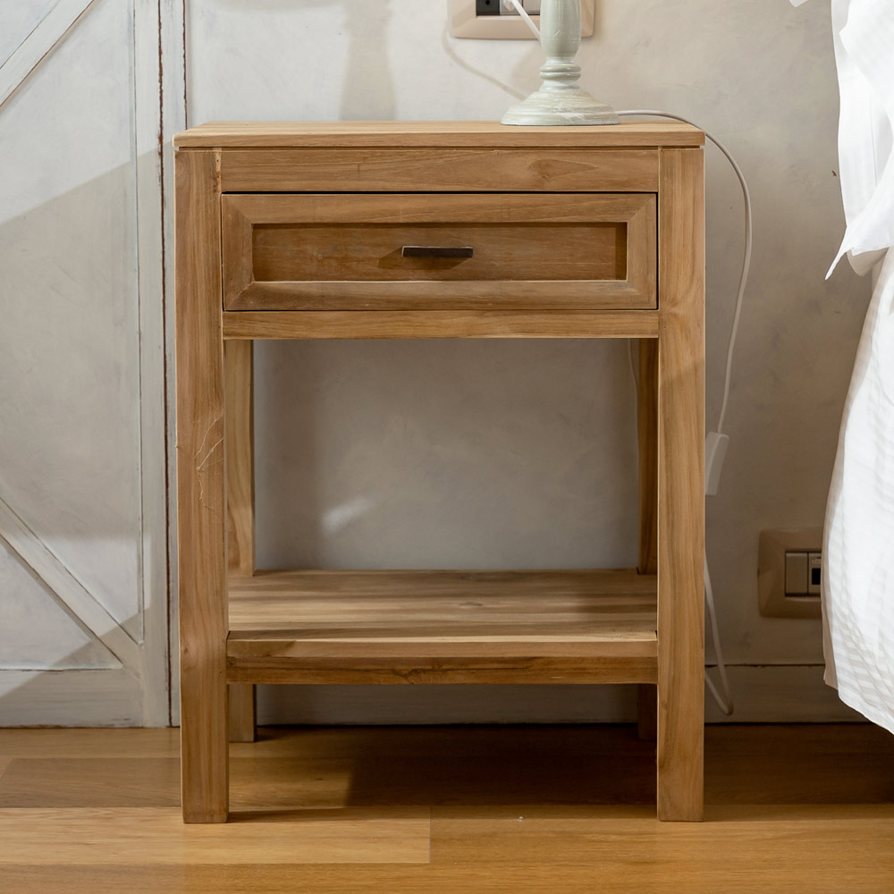 Dit massief teakhouten nachtkastje is een eenvoudig en functioneel meubelstuk, ideaal voor de slaapkamer of als dressoir in andere kamers van het huis. Het vakmanschap en de natuurlijke houtnerf geven het meubelstuk een warme en authentieke uitstraling, perfect voor een tijdloze stijl.