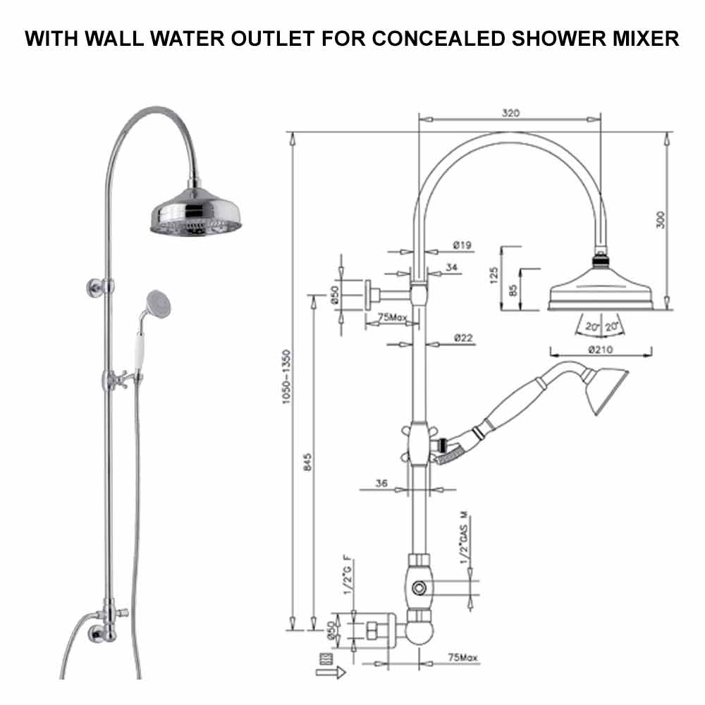 Messing douchezuil met ronde douchekop en antieke handdouche Made in Italy.
