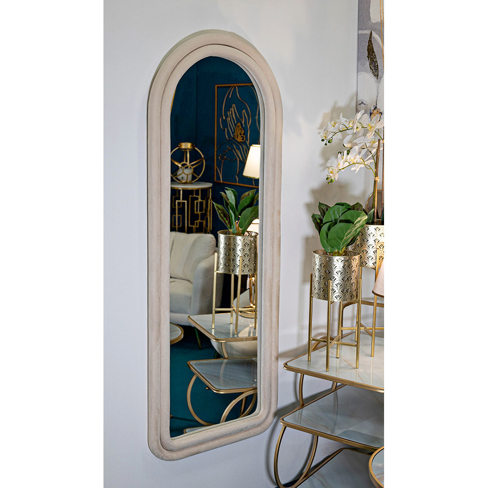 Deze ingelijste spiegel belichaamt de essentie van moderne verfijning en maakt een statement als middelpunt in elke kamer. Het frame, met zachte en omhullende rondingen , heeft een ontwerp dat doet denken aan oude spitsboogvensters, wat een vleugje klassieke elegantie met zich meebrengt, opnieuw geïnterpreteerd in een eigentijdse sleutel. De afwerking van het frame past harmonieus in elke omgeving, waardoor een kleurencontrast ontstaat dat puur een lust voor het oog is.