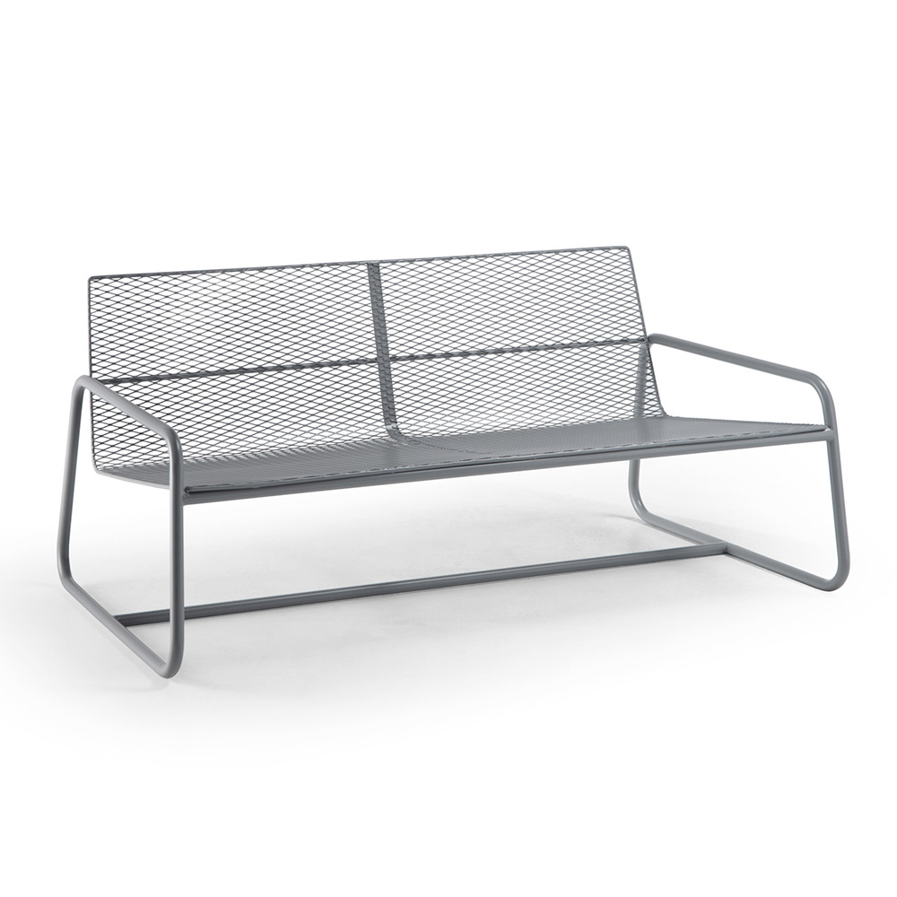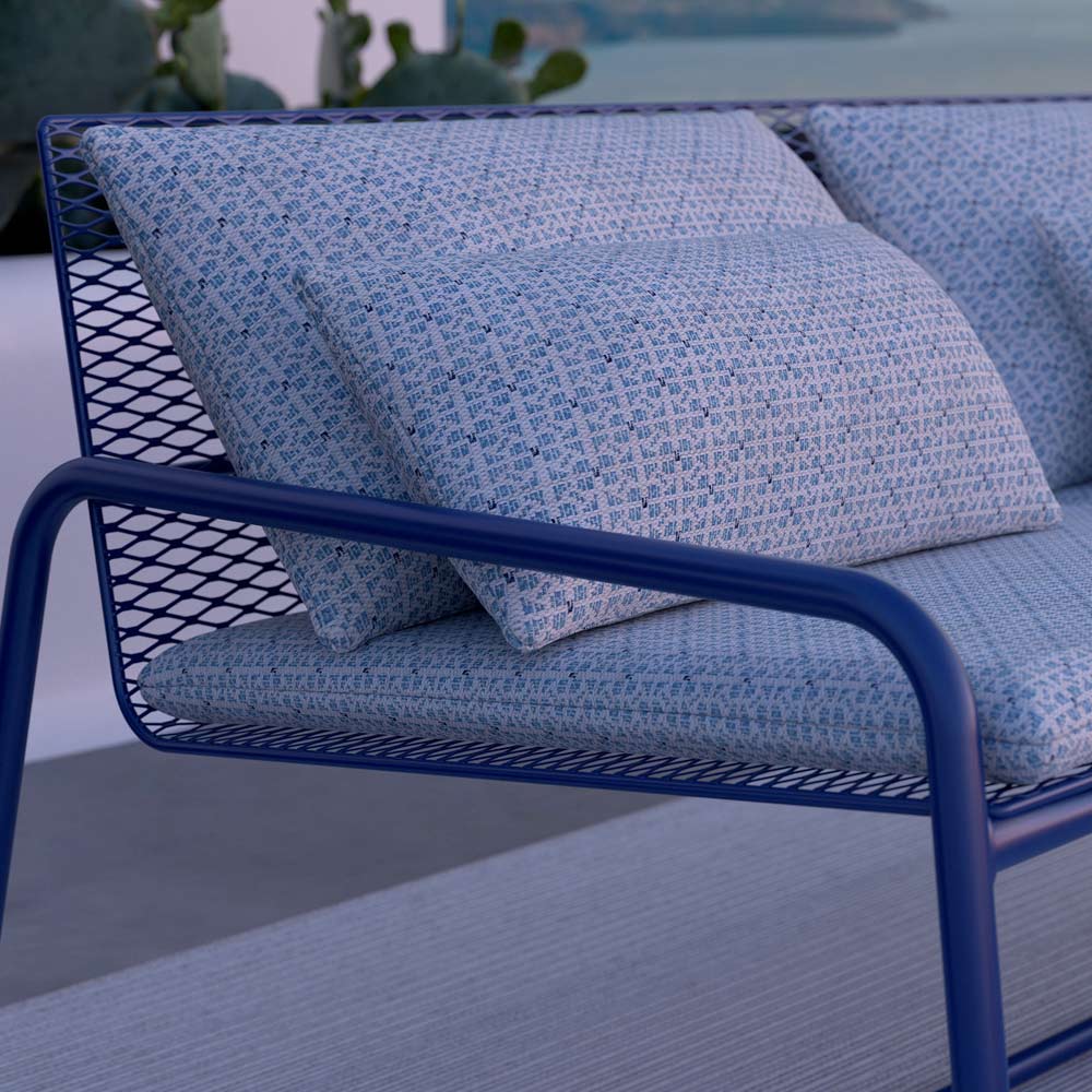 Buitenbank van metaal met bijpassende stoffen kussens verkrijgbaar in verschillende afwerkingen, luxe artikel gemaakt in Italië.