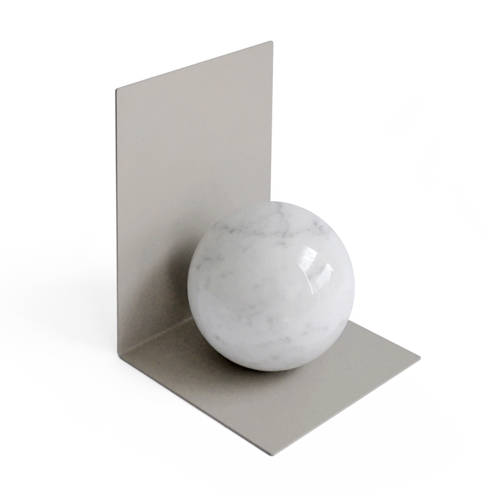 Deze marmeren boekensteun is de perfecte synthese tussen functionaliteit en moderne sculptuur . Het ontwerp is gedurfd minimalistisch, waarbij een marmeren bol een metalen plaat ontmoet, waardoor een visueel contrast ontstaat dat een echte lust voor het oog is.