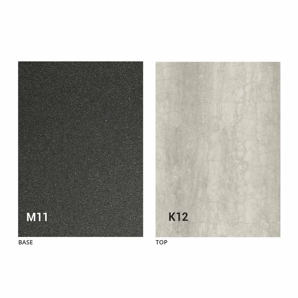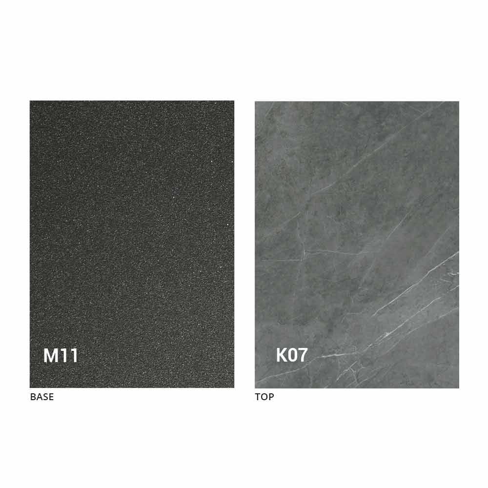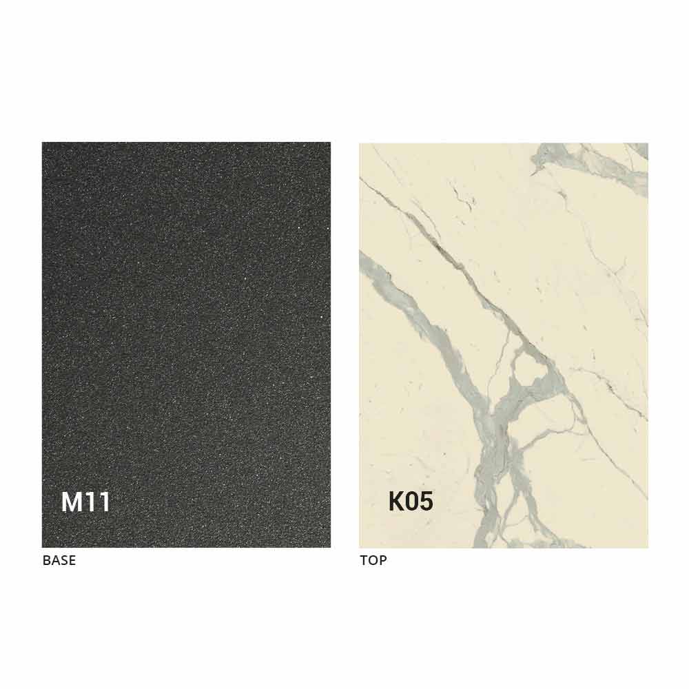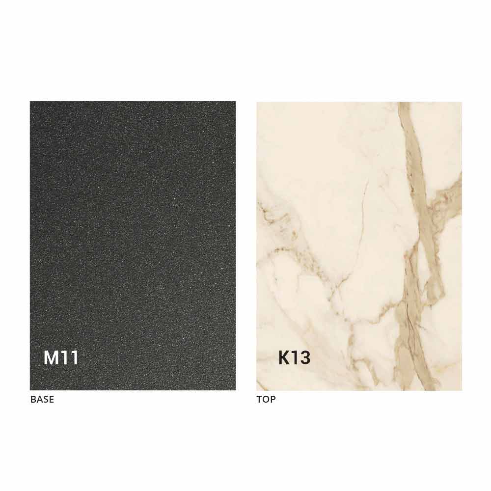 een blad van MDF-plaat met laminam-keramiek op het oppervlak, verkrijgbaar in verschillende afwerkingen, en een onderstel van met grafiet geverfd reliëf in