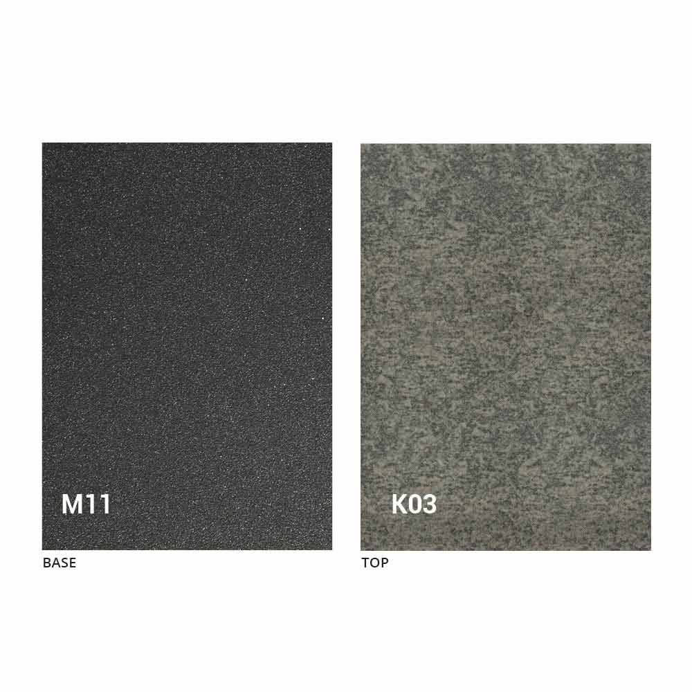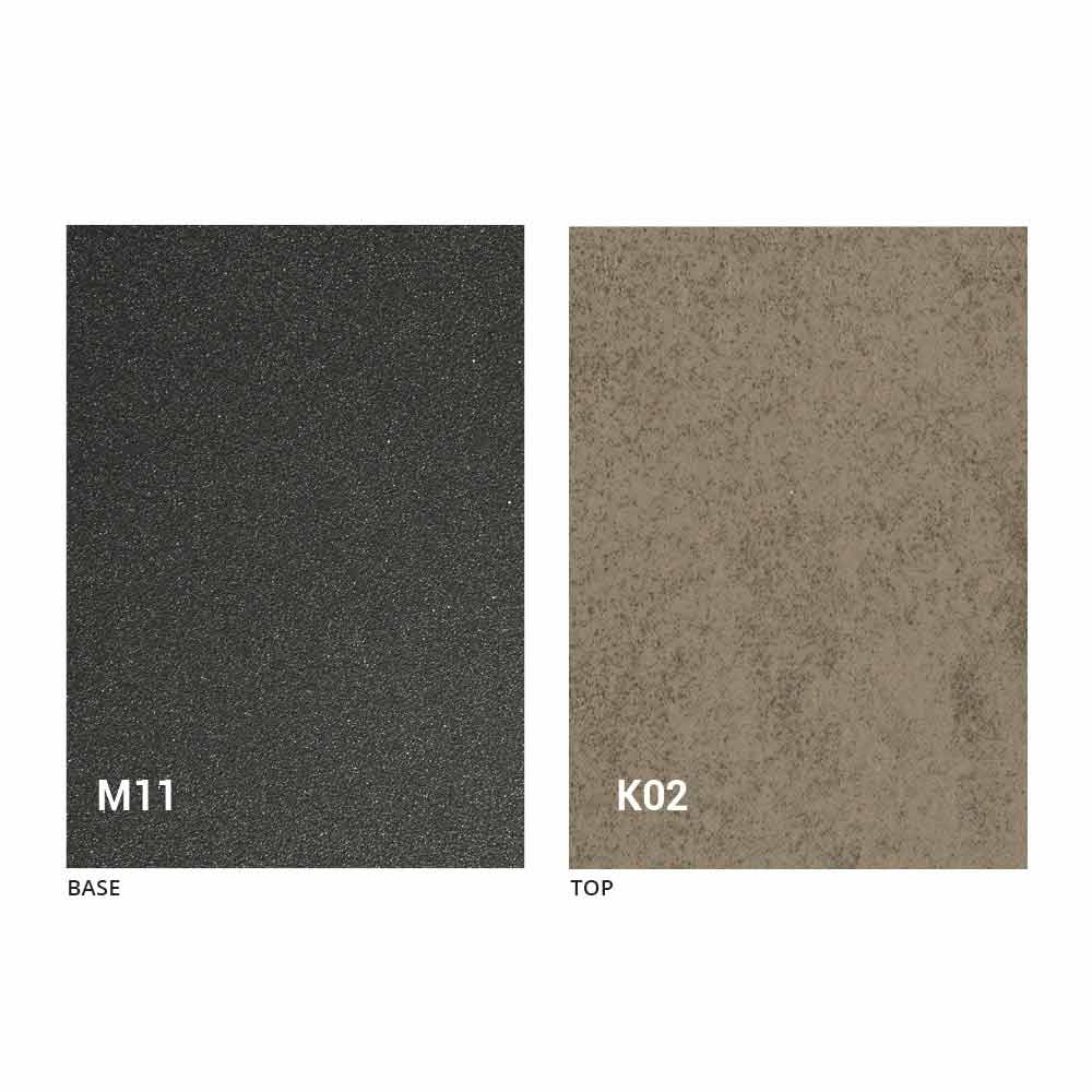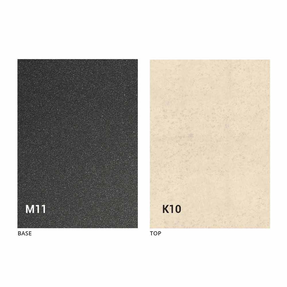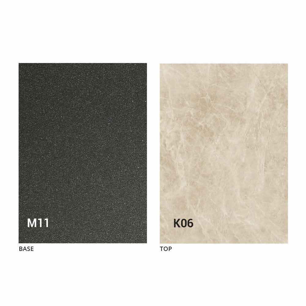 een blad van MDF-plaat met laminam-keramiek op het oppervlak, verkrijgbaar in verschillende afwerkingen, en een onderstel van met grafiet geverfd reliëf in