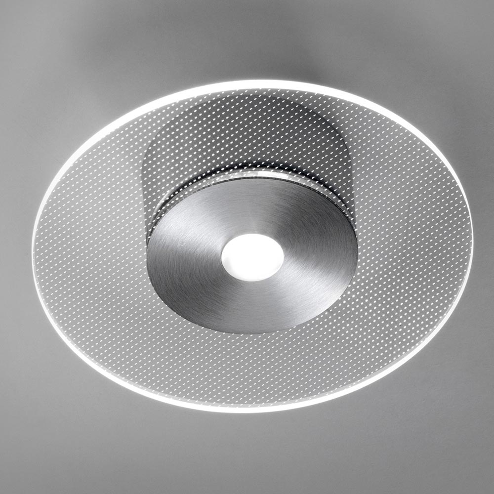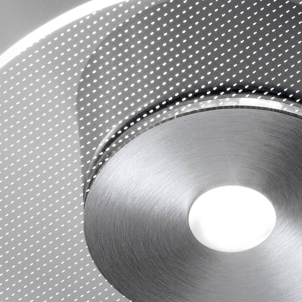 Plafondlamp voor binnen, gemaakt van een metalen kern en een structuur van plexiglas (PMMA) met microdot-bewerking, wat zorgt voor een betere lichtverspreiding.