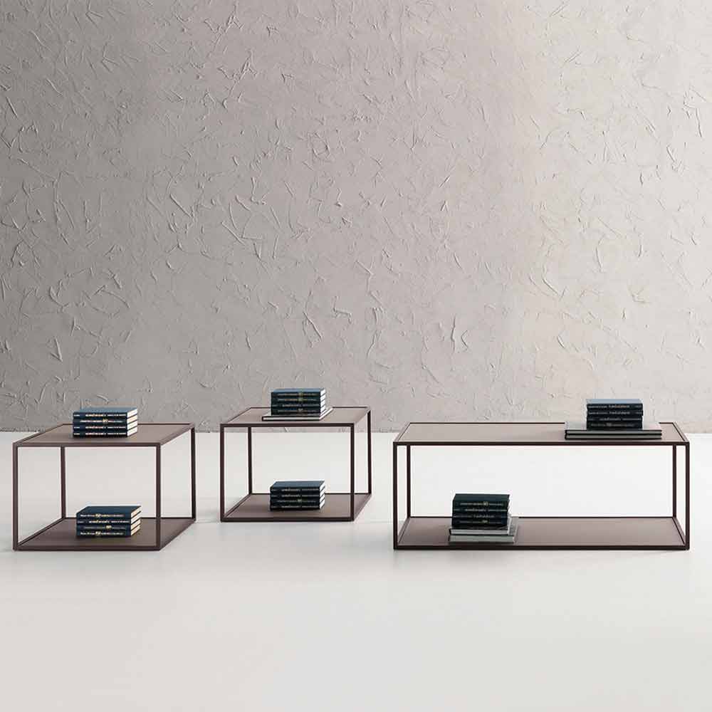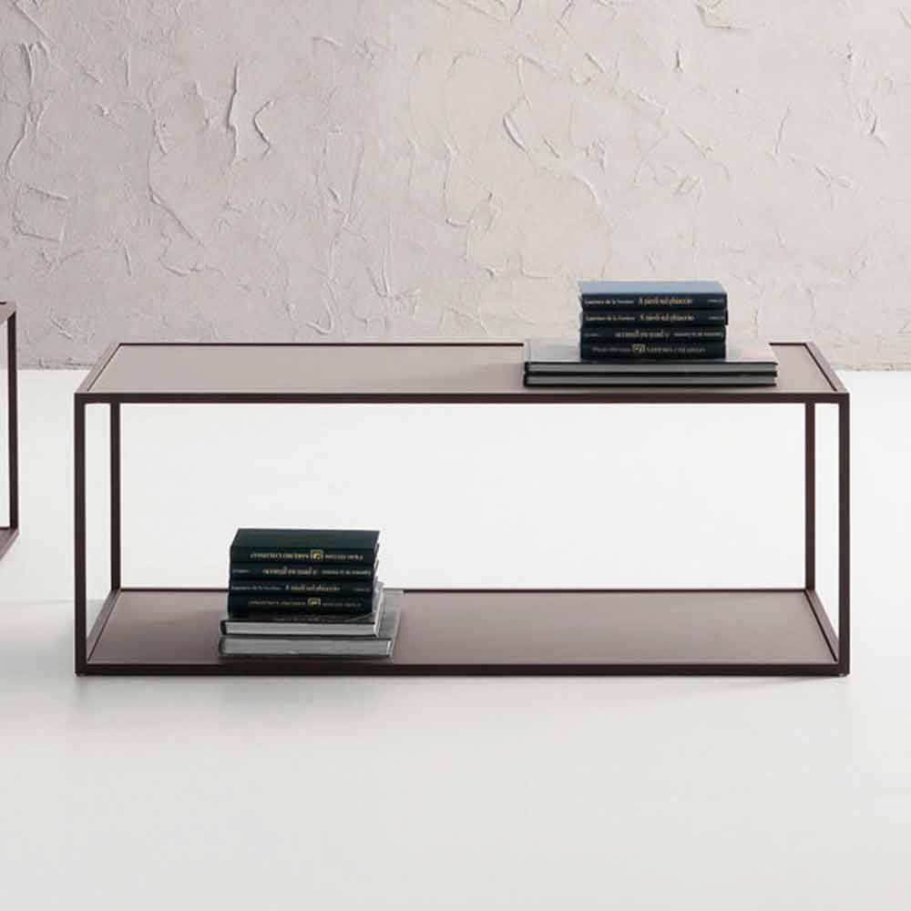 Salontafel gemaakt in Italië met een structuur van geverfd metaal met grafietafwerking en dubbel blad van satijnglas met anti-vingerafdruk en modderafwerking. Een product waarvan het idee is gebaseerd op eenvoud en wezenlijkheid om een meubelstuk tot leven te brengen met een moderne en veelzijdige stijl die in staat is om zich aan elke woonkamer aan te passen en een innovatief en elegant tintje met zich meebrengt. De specifieke conformatie van de structuur maakt het mogelijk om een dubbel steunoppervlak te verkrijgen en biedt zo de mogelijkheid om verschillende nuttige objecten zoals boeken, tijdschriften of afstandsbedieningen te organiseren, maar ook eenvoudige decoratieve elementen die het ontwerp verrijken en de waarde ervan verhogen door het te benadrukken. de exclusieve esthetiek .