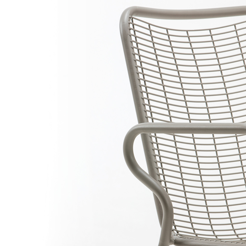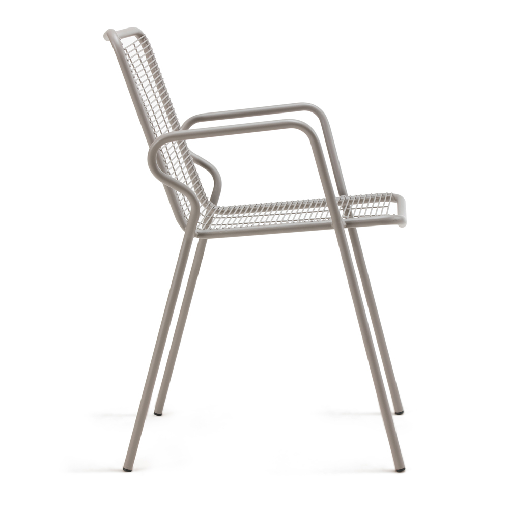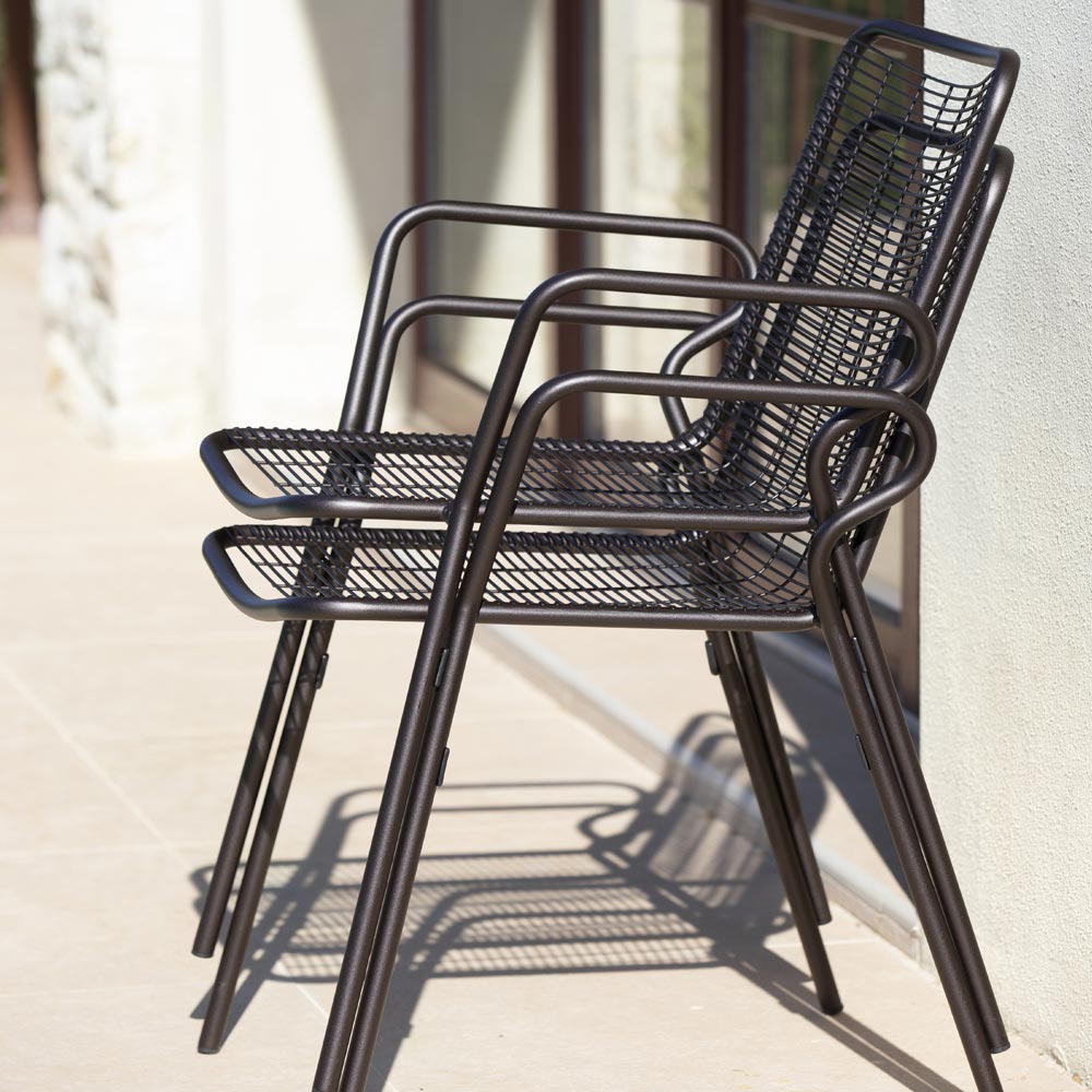 Stapelbare buitenstoel van gepoedercoat gegalvaniseerd ijzer met armleuningen. Gemaakt in Italië, 2 stuks.
