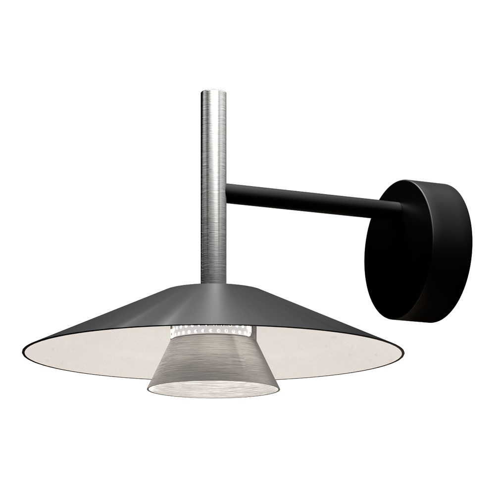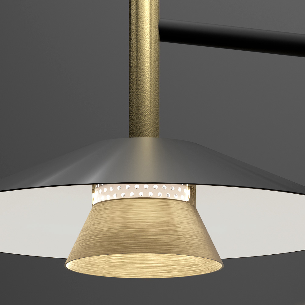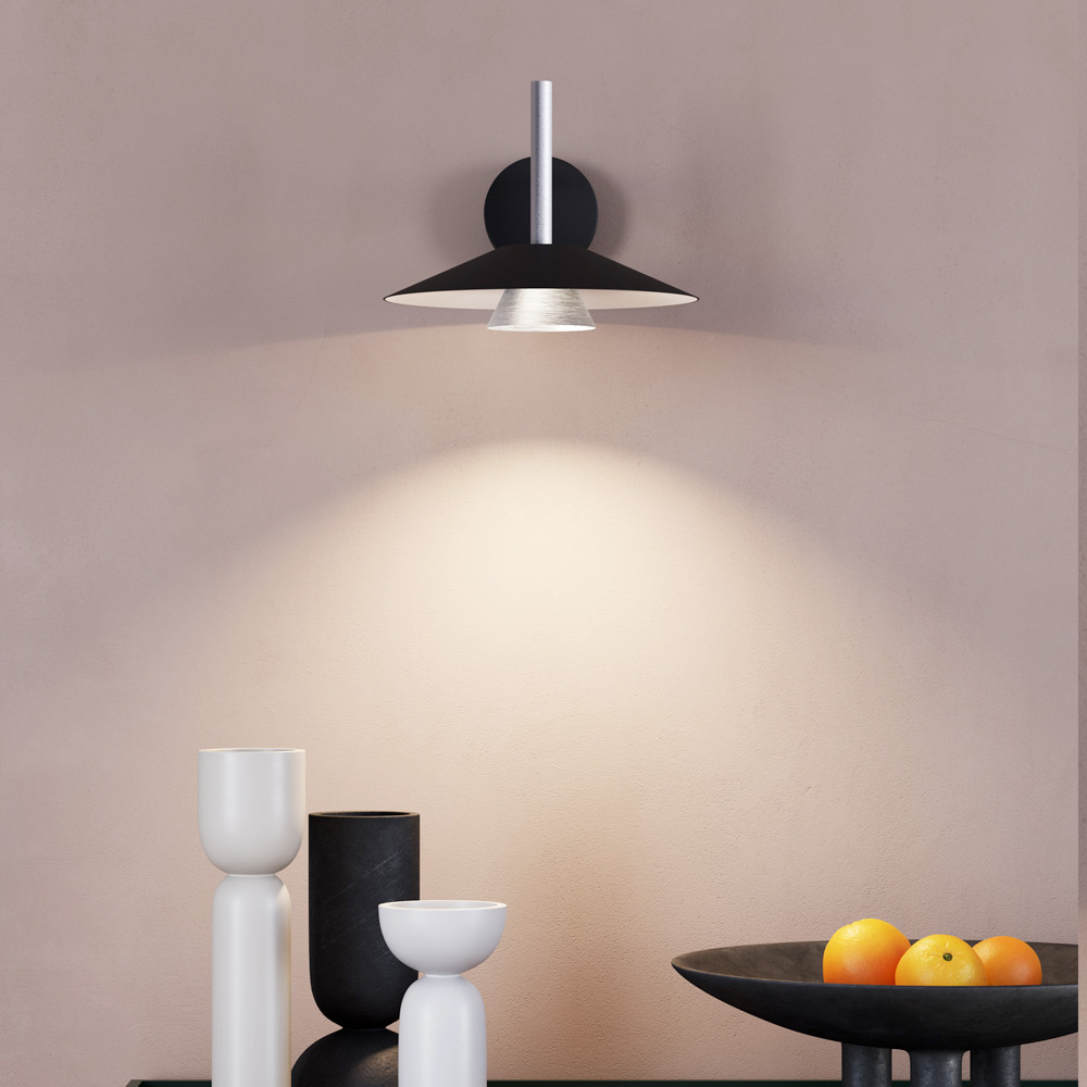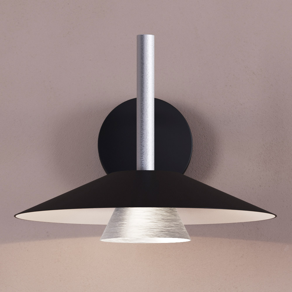 Deze lamp is een perfecte combinatie van eigentijds design en industriële elegantie , ontworpen voor wie houdt van verfijnde details en een gedurfde esthetiek. De geometrische structuur, met een conische diffuser en een grote reflecterende schijf, creëert een fascinerend spel van volumes en contrasten , wat zorgt voor een gericht en omhullend licht.