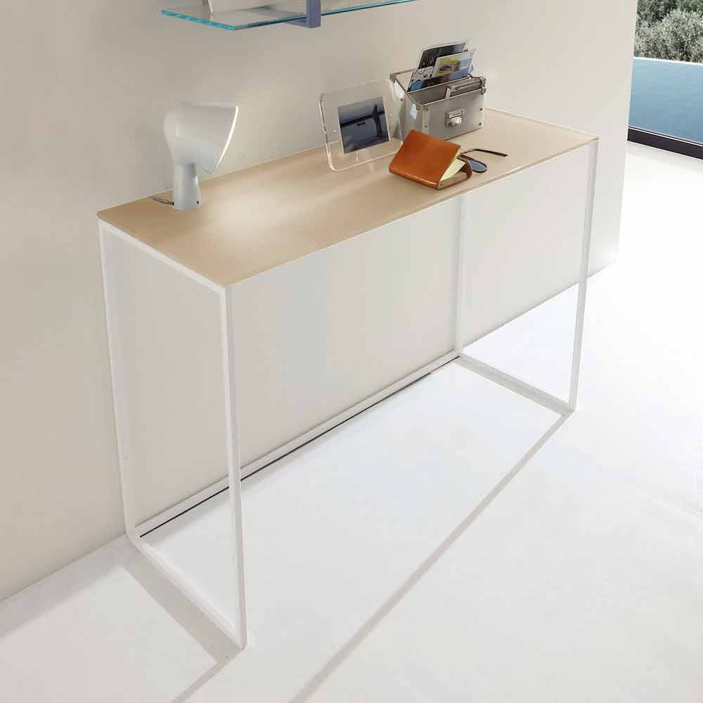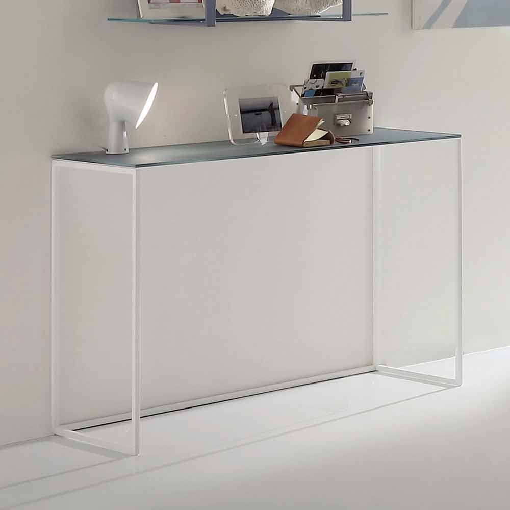 Moderne console gemaakt in Italië met glazen blad en wit gelakte metalen structuur . Een eenvoudige en veelzijdige inrichtingsoplossing die elke ruimte kan karakteriseren door een vleugje stijl te geven aan de omgeving. Dankzij de essentiële lijnen kan het de rol spelen van een praktisch steunvlak in verschillende delen van het huis, zoals de ingang of de woonkamer, en tegelijkertijd een perfect decoratief element bewijzen dat het meubilair kan voltooien. Dankzij de keuze combineer je de onbetwiste moderniteit van het metaal met de tijdloze elegantie van het kristal en zijn prachtige afwerkingen, het eindresultaat biedt een innovatief en origineel idee dat elke kamer uniek kan maken, zij het in zijn extreme eenvoud.
