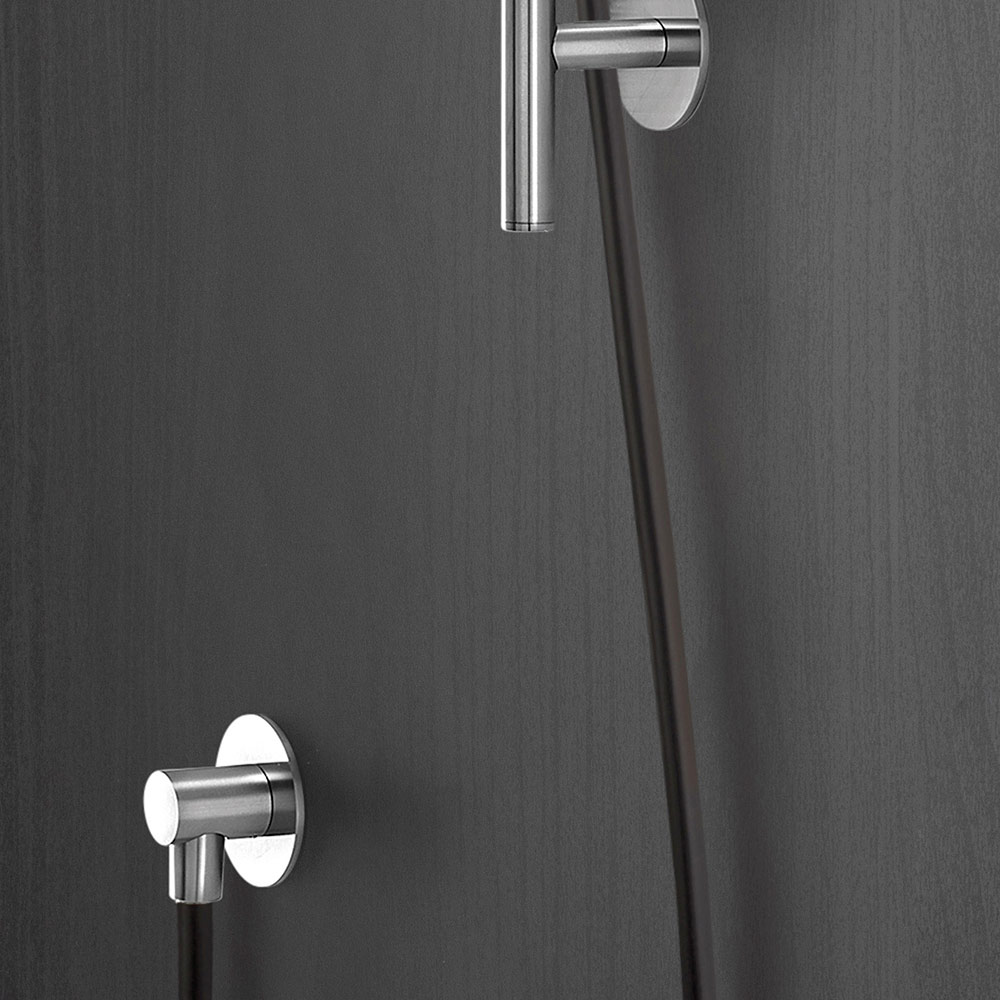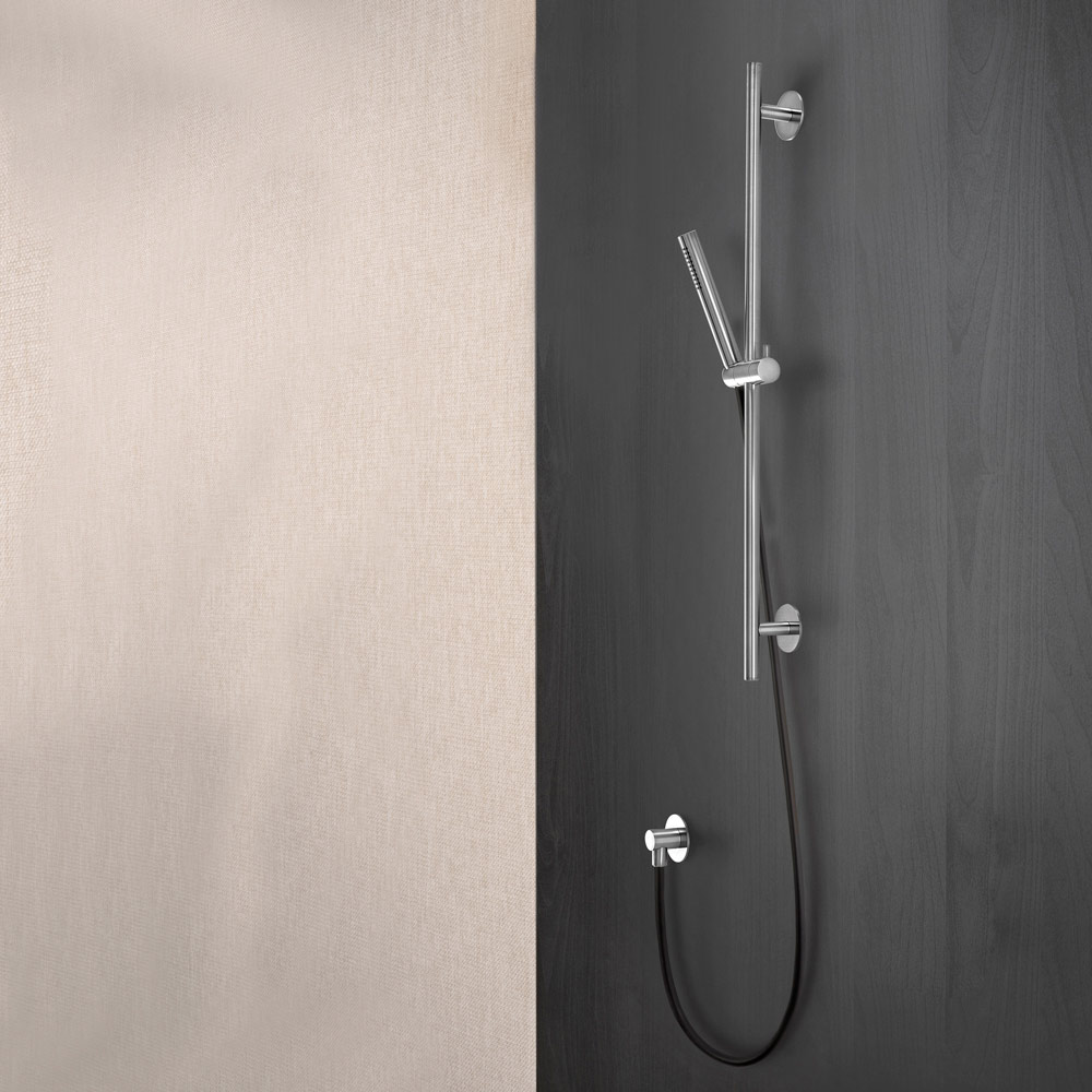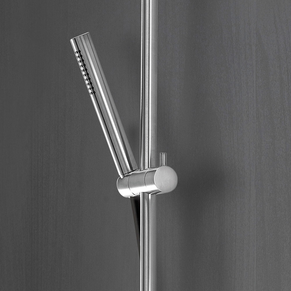 Stalen douchestang bestaande uit: oprit met ronde stalen staaf, ronde antikalk stalen douchekop, darkflex anti-twist flexibele slang Made in Italy